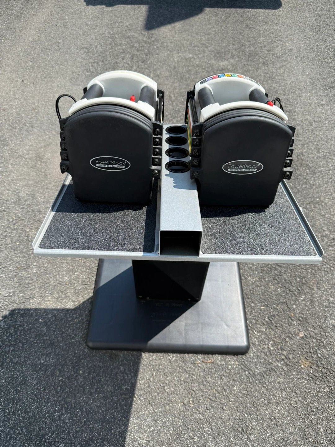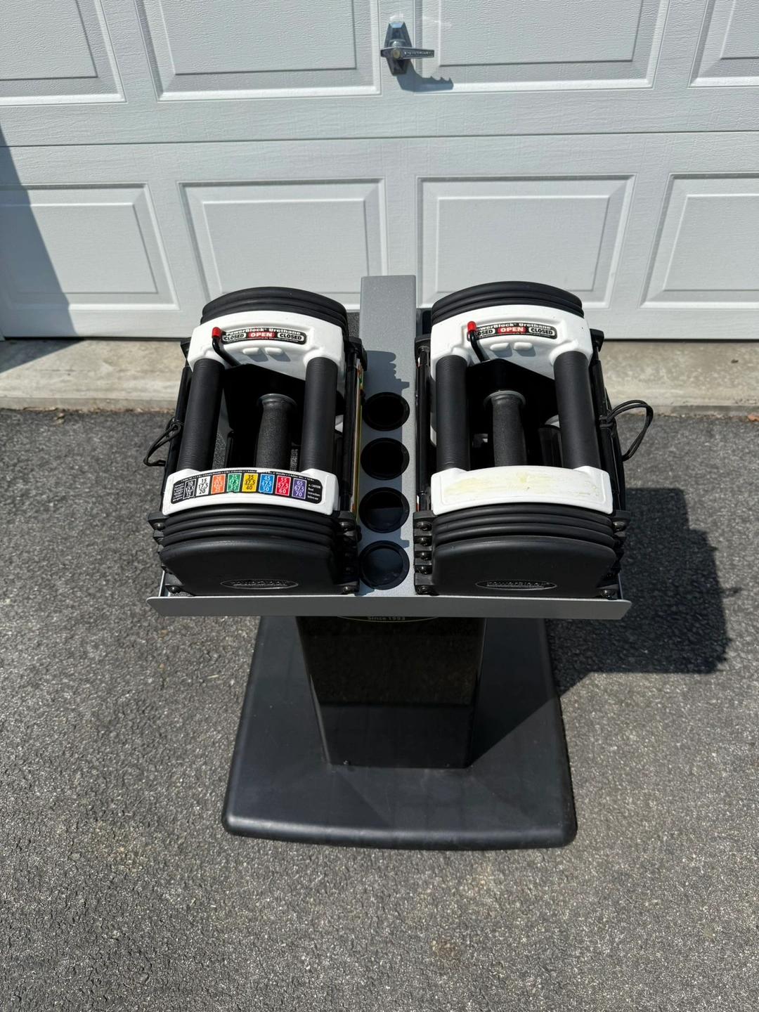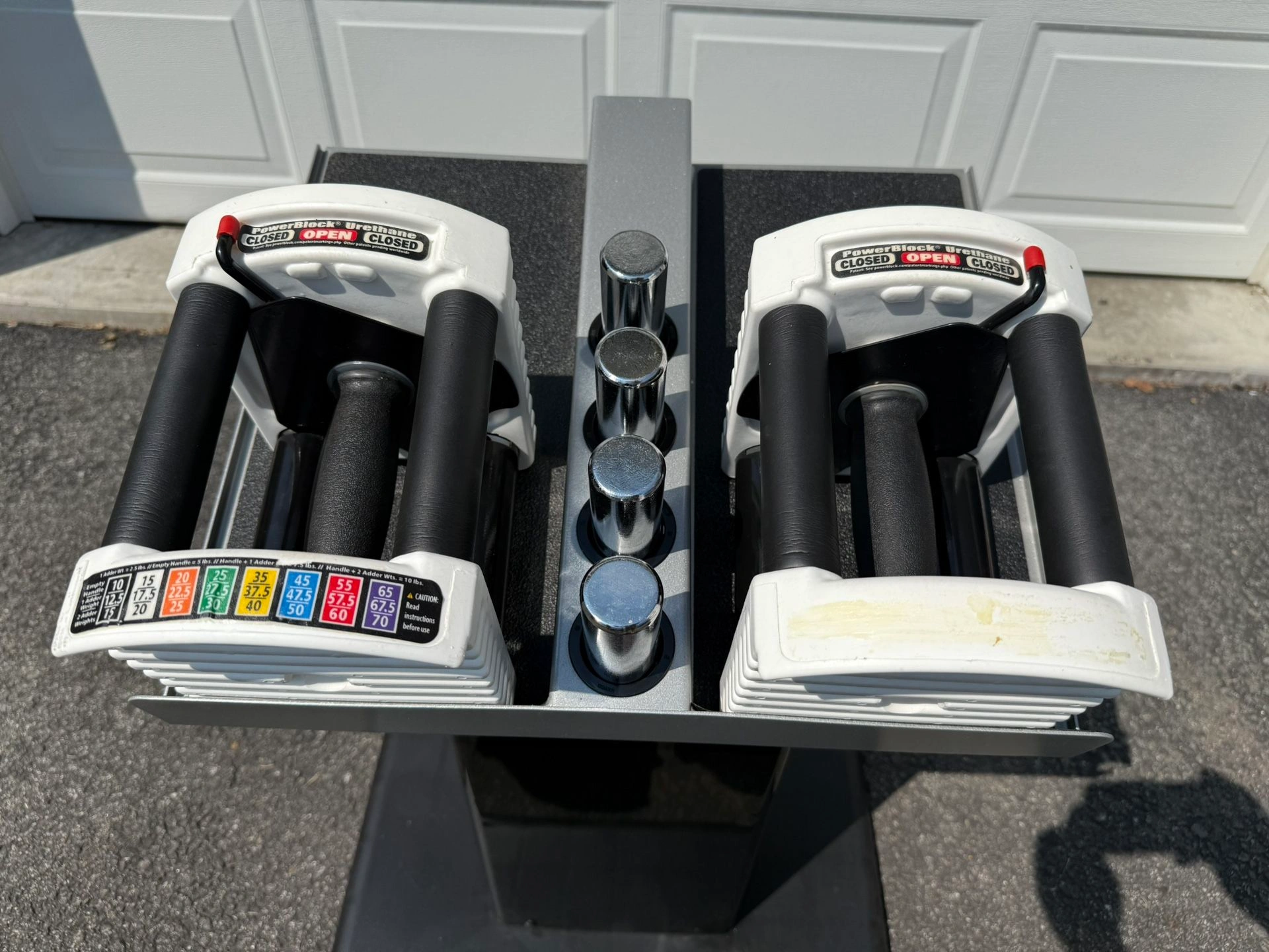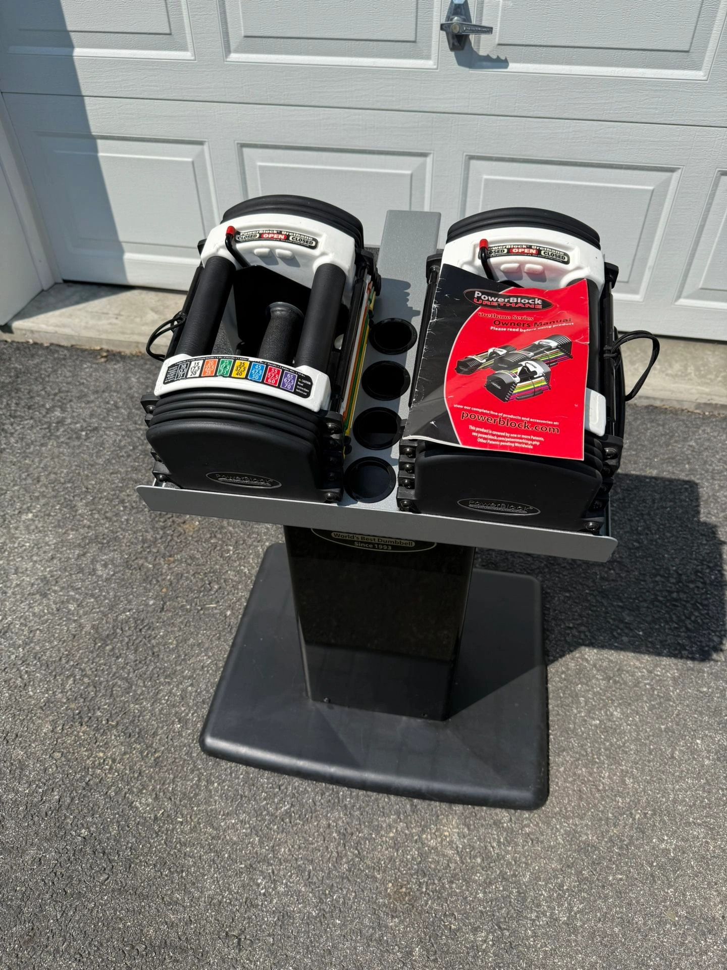 15PowerBlock Urethane Adjustable Dumbbells These go up to 40 pounds in each hand. But you can buy additional weight for it. They start off at 10 pounds and go up in 2.5 pound increments. Comes with the PowerBlock stand. Everything is in phenomenal condition The weights are rubber urethane, so they will never rust. Also comes with the owners manual. Type: Adjustable Brand: PowerBlock