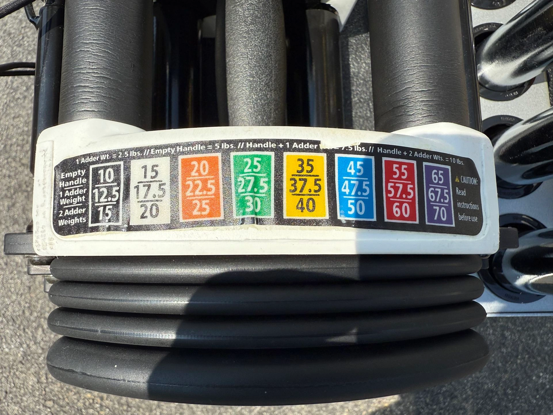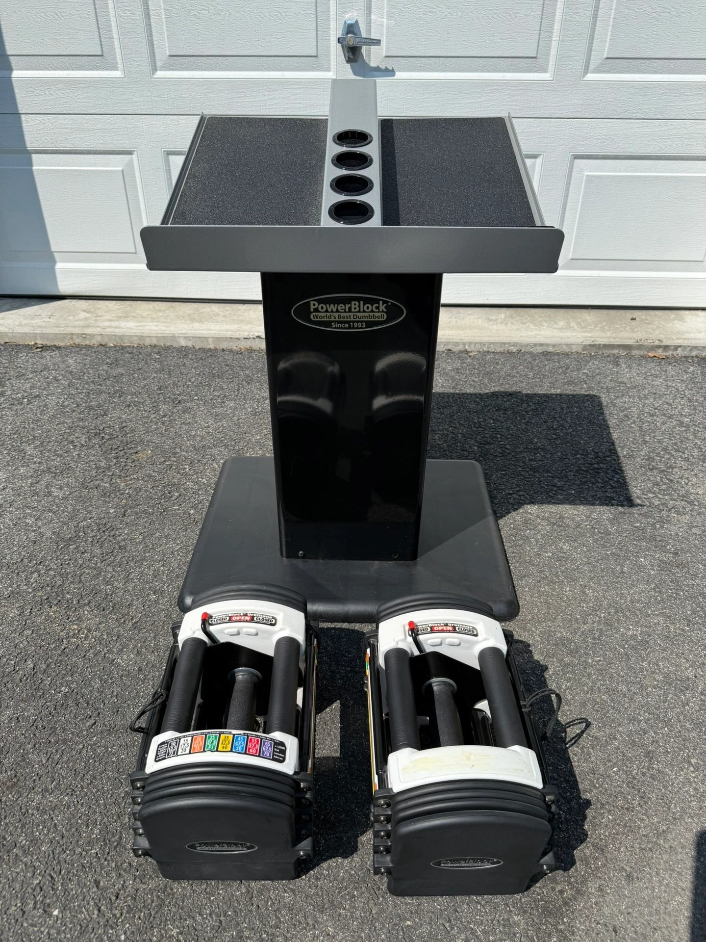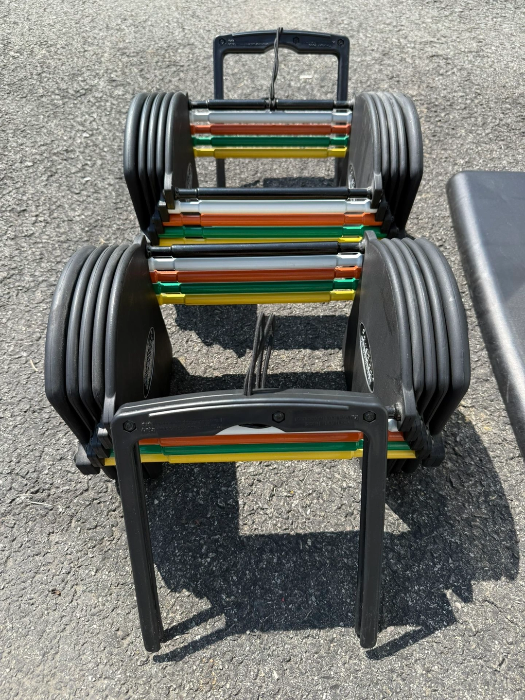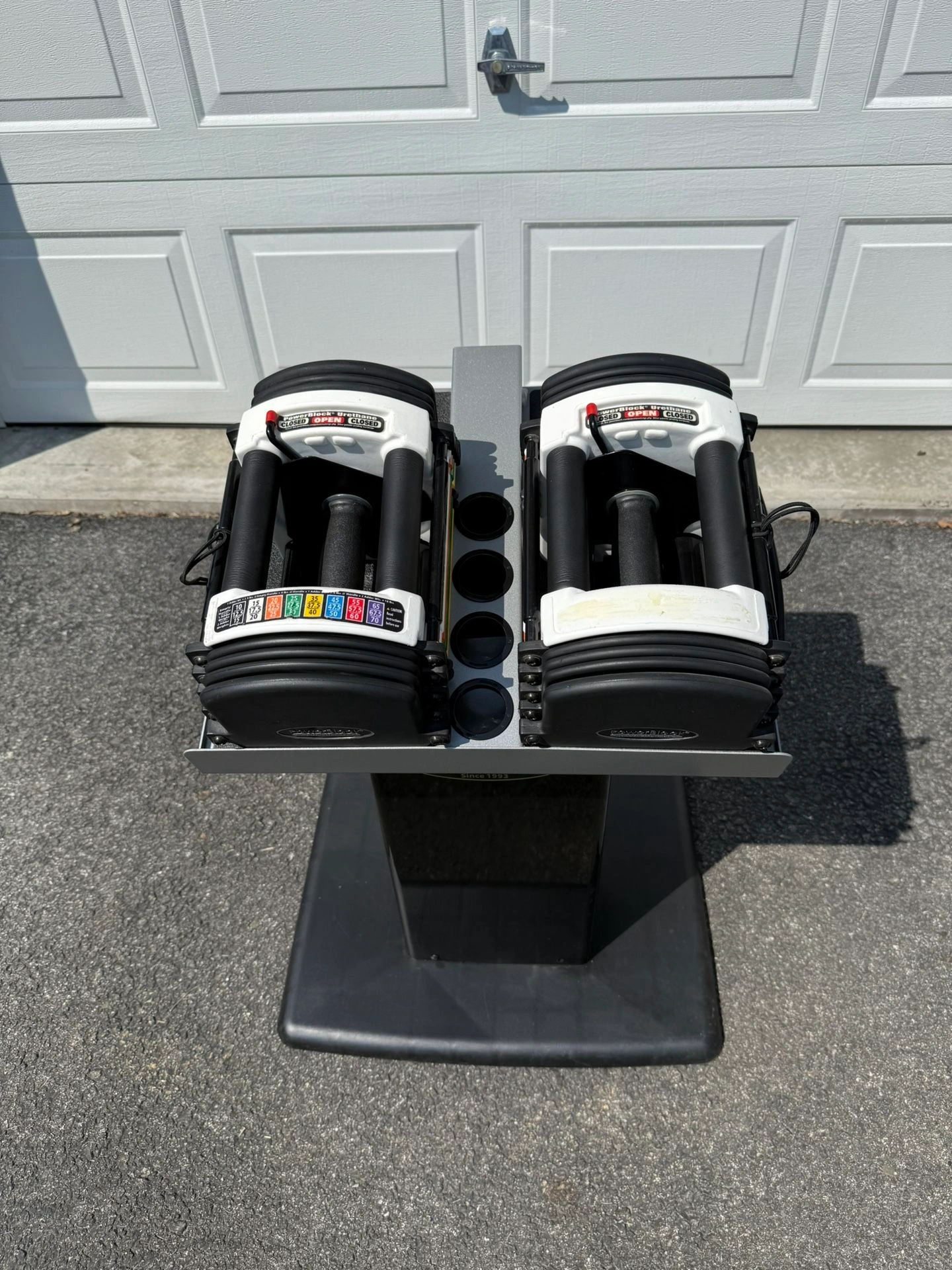 15PowerBlock Urethane Adjustable Dumbbells These go up to 40 pounds in each hand. But you can buy additional weight for it. They start off at 10 pounds and go up in 2.5 pound increments. Comes with the PowerBlock stand. Everything is in phenomenal condition The weights are rubber urethane, so they will never rust. Also comes with the owners manual. Type: Adjustable Brand: PowerBlock