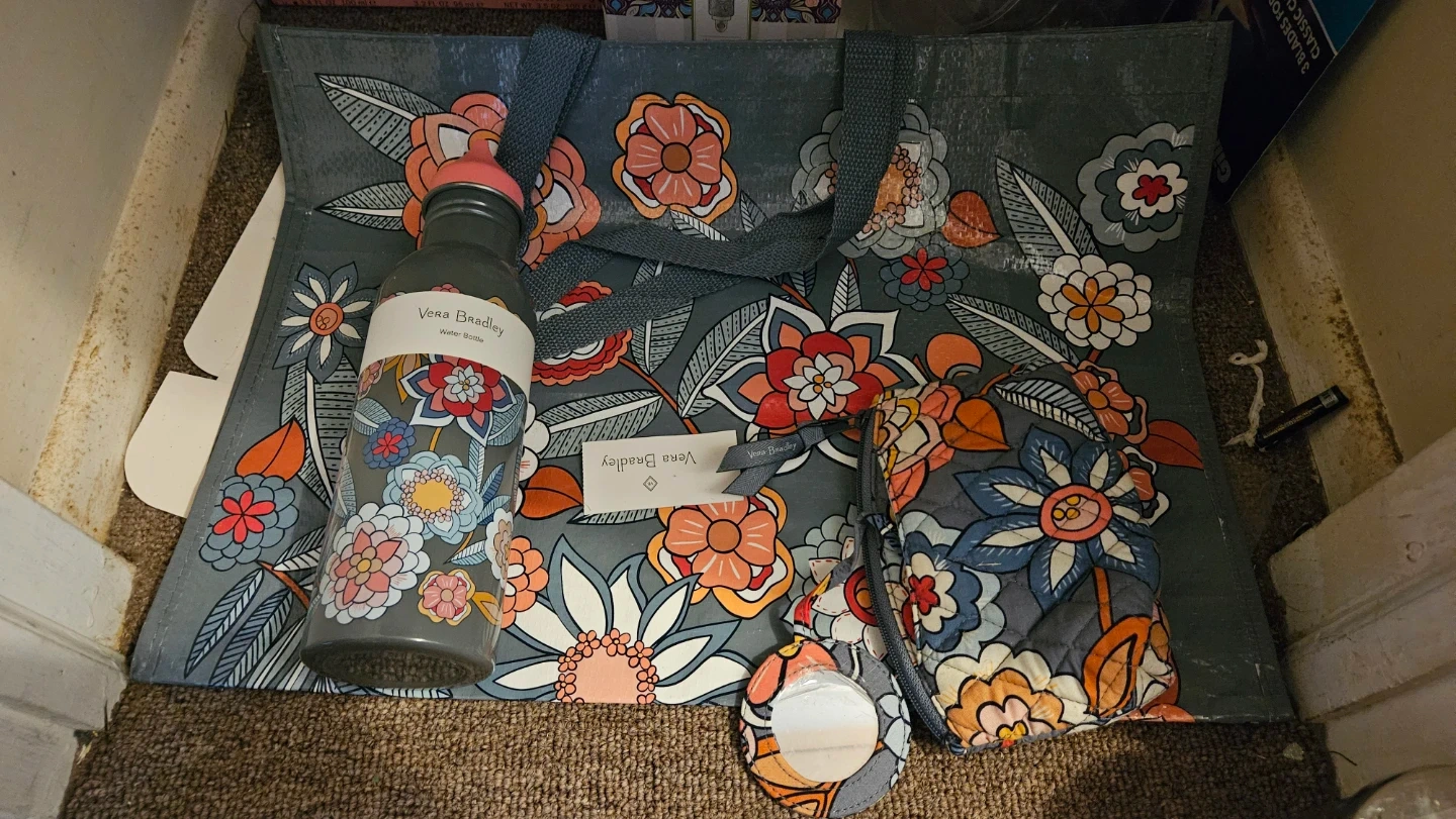 Vera Bradley stainless steel water bottle with a floral pattern. Includes a Vera Bradley reusable shopping bag and a small zippered pouch with a mirror.