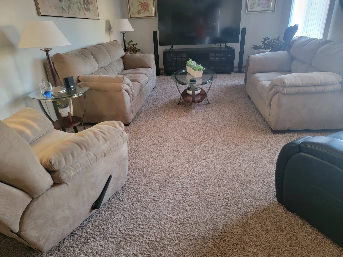 Taupe fabric recliner armchair. This chair features a manual recliner with a side lever. It's comfortable and has plush cushioning. Recliner mechanism is fully functional.