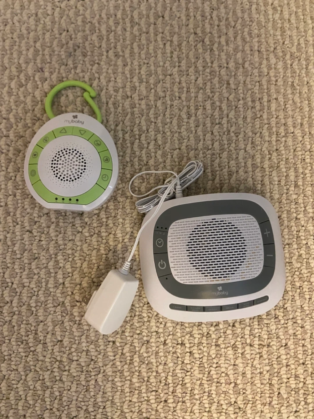 This MyBaby Sound Spa machine includes two devices for soothing sounds. It comes with a power adapter for easy use. These devices are great for creating a calming atmosphere.
