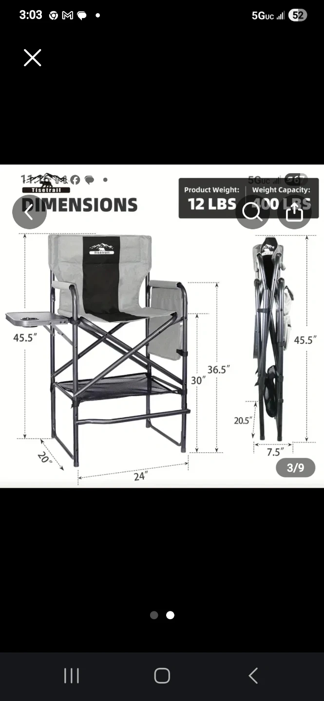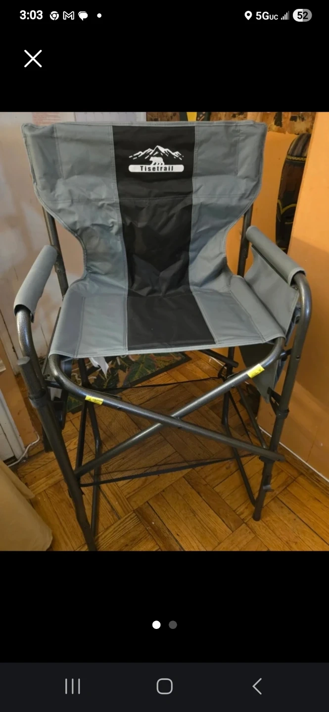 It features a sturdy metal frame with a fabric seat and back. Includes a convenient side table and a lower mesh shelf. Chair dimensions are 24" W x 20" D x 45.5" H. It folds for easy storage and transport. Quite heavy and sturdy. Friday, Saturday or Sunday pick up in Astoria only