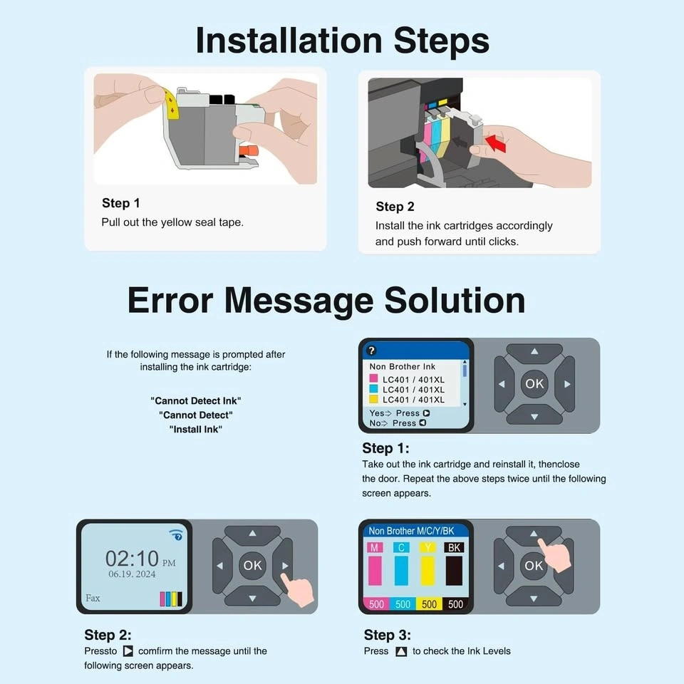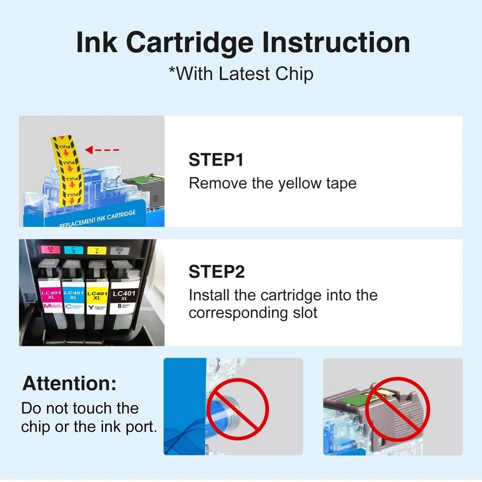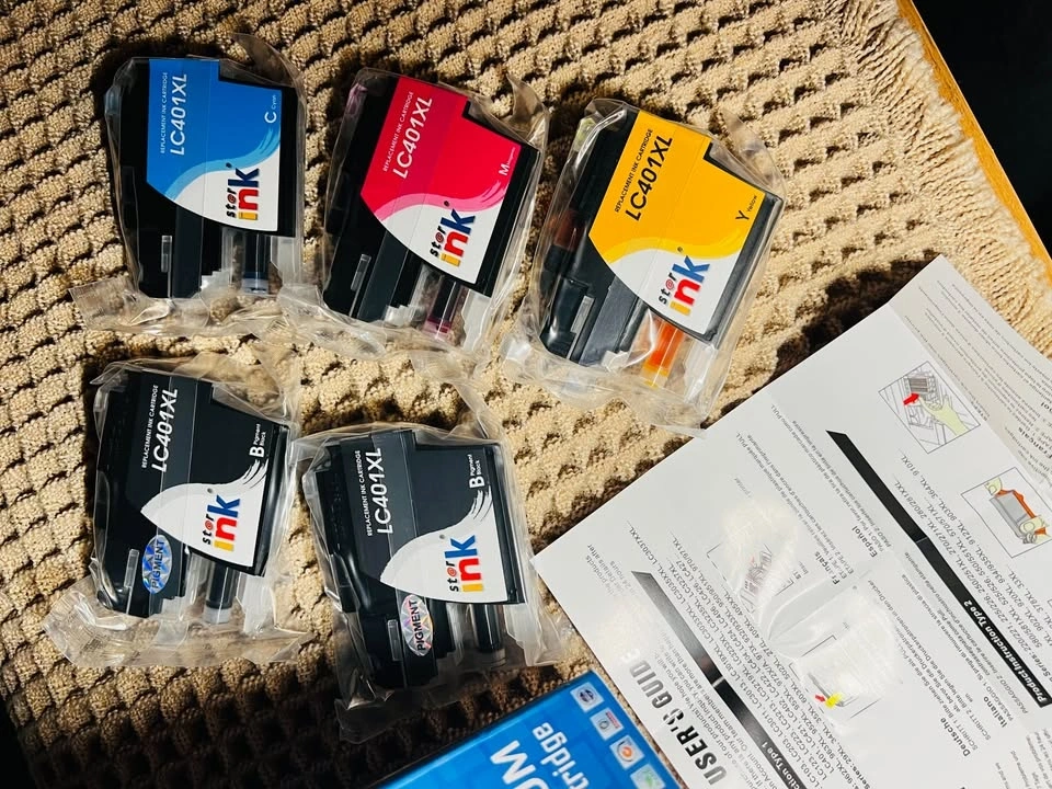 New StarInk LC401XL ink cartridges, 5 pack. Includes 2 black, 1 cyan, 1 magenta, and 1 yellow. These are high yield and compatible with MFC-J1010DW, MFC-J1012DW, MFC-J1170DW, DCP-J1800DW, DCP-J1140DW, and DCP-J1050DW printers. They provide clear, smooth prints with natural colors.