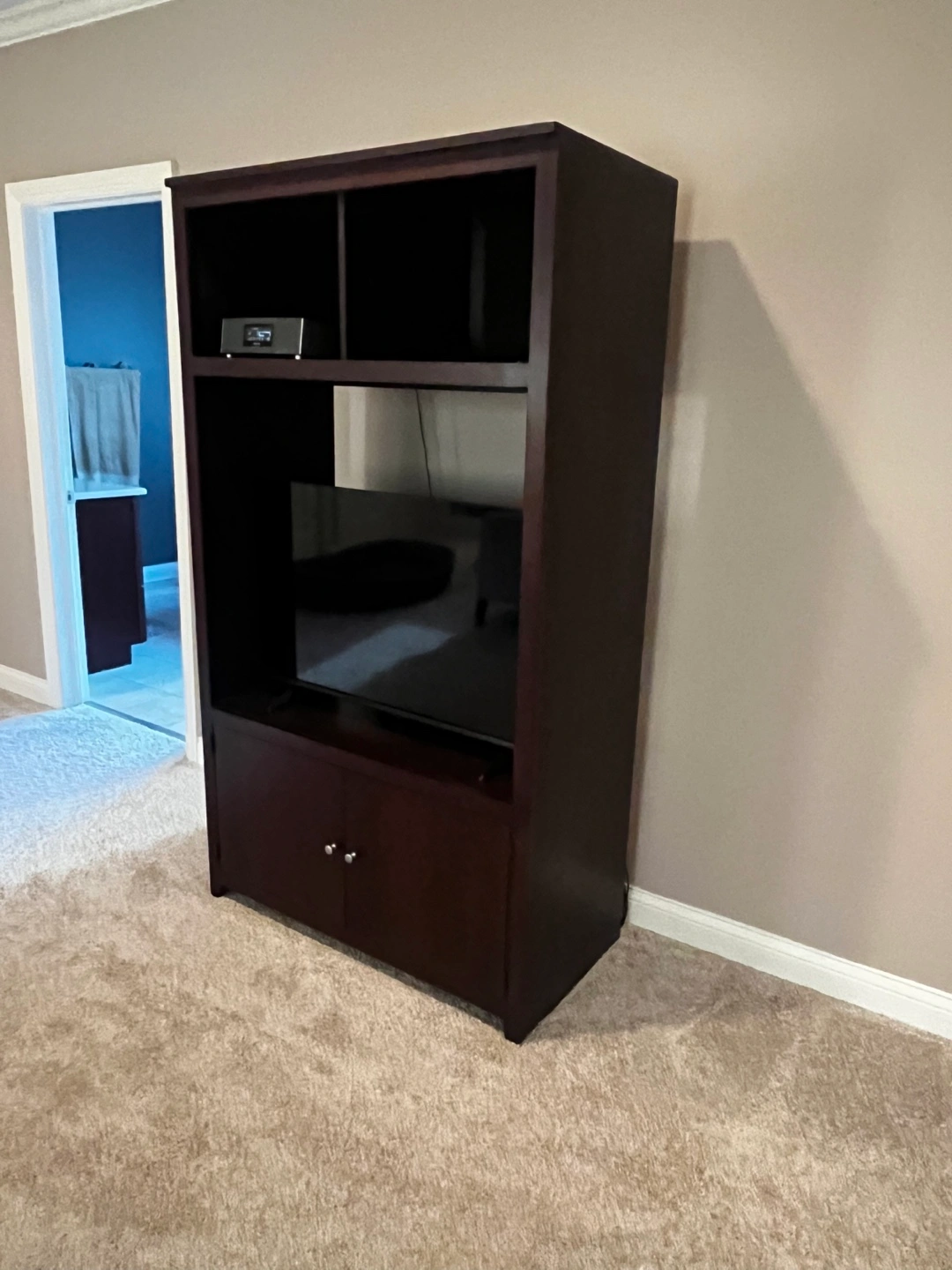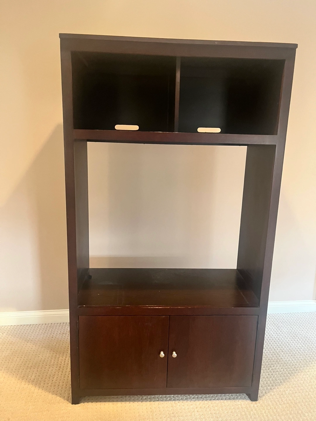 Beautiful and sturdy dark wood entertainment center with built-in storage. Features: