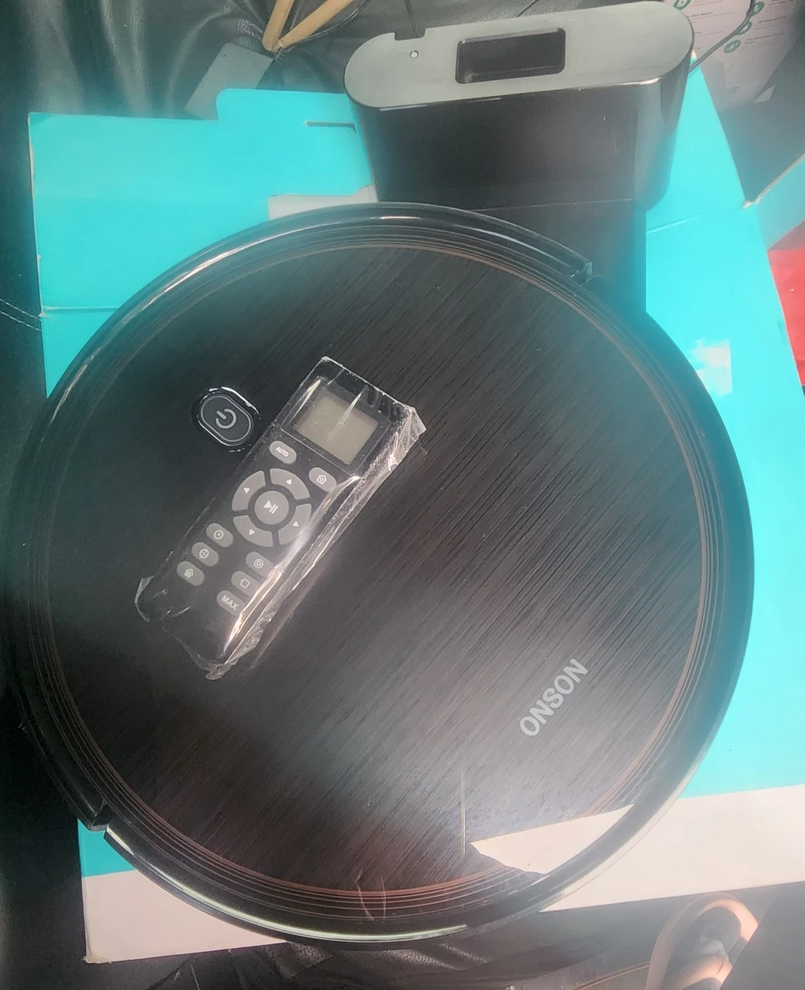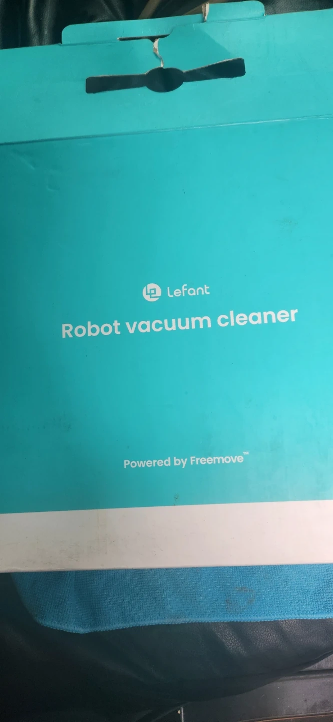 This is a Lefant robot vacuum cleaner. It's black with a brushed finish and comes with a remote control. It's powered by Freemo.