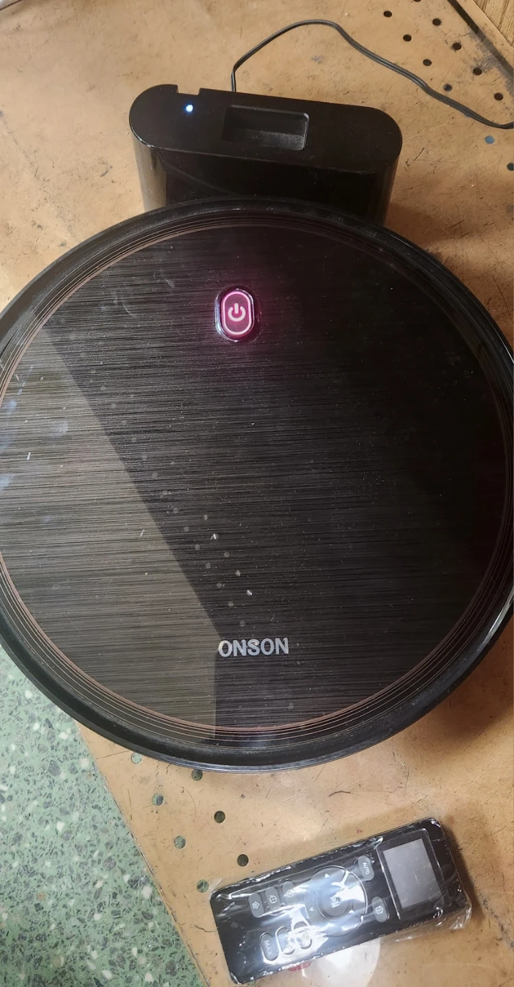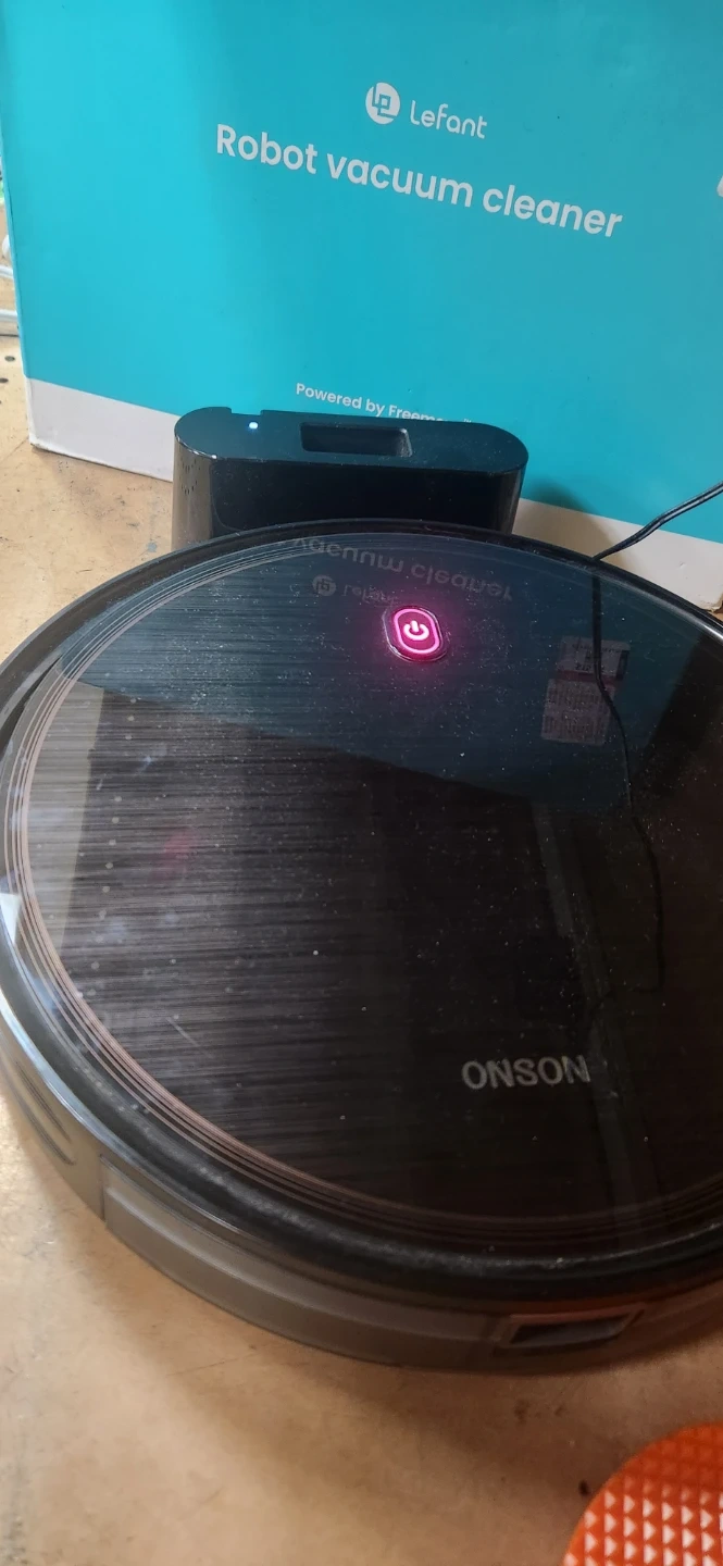 This is a Lefant robot vacuum cleaner. It's black with a brushed finish and comes with a remote control. It's powered by Freemo.