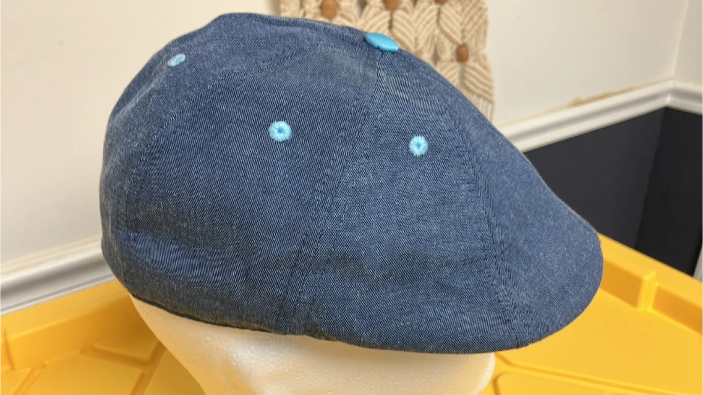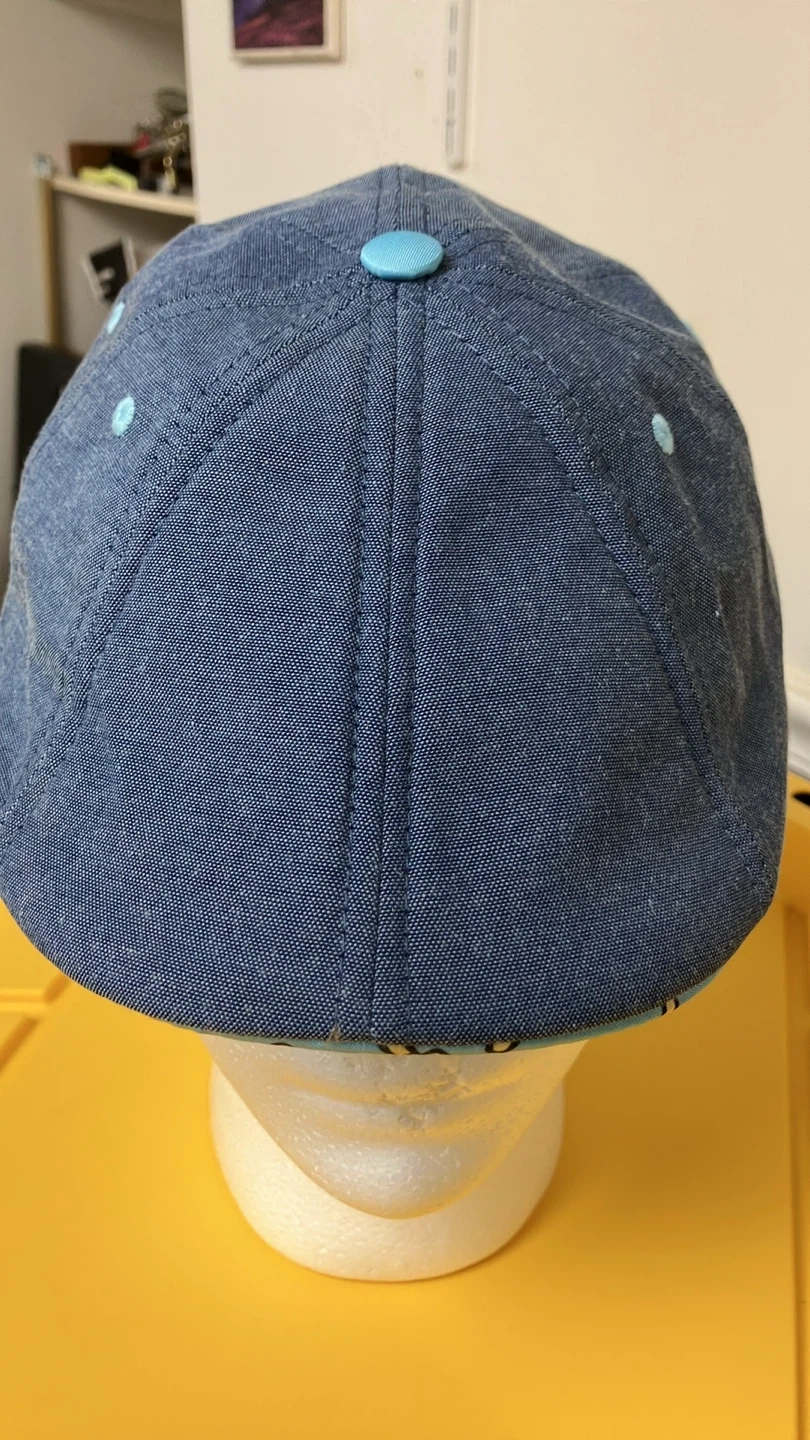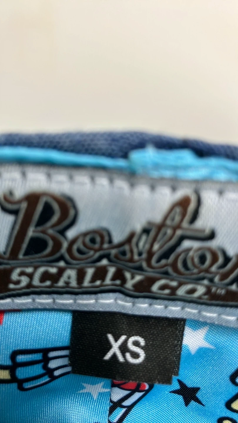 This is a denim flat cap from Boston Scully Company. It's a size XS with a fun popsicle and star liner pattern. The exterior is a classic blue denim.