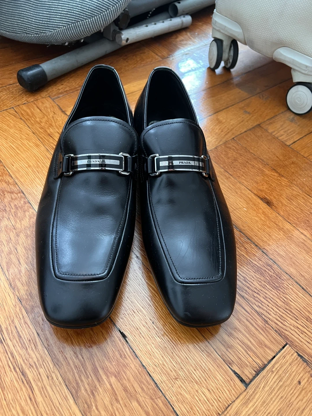Selling a pair of Prada black leather loafers in size 9 1/2. These stylish loafers are perfect for any occasion. They are made of high-quality leather and feature the iconic Prada logo. Grab them while they're still available!