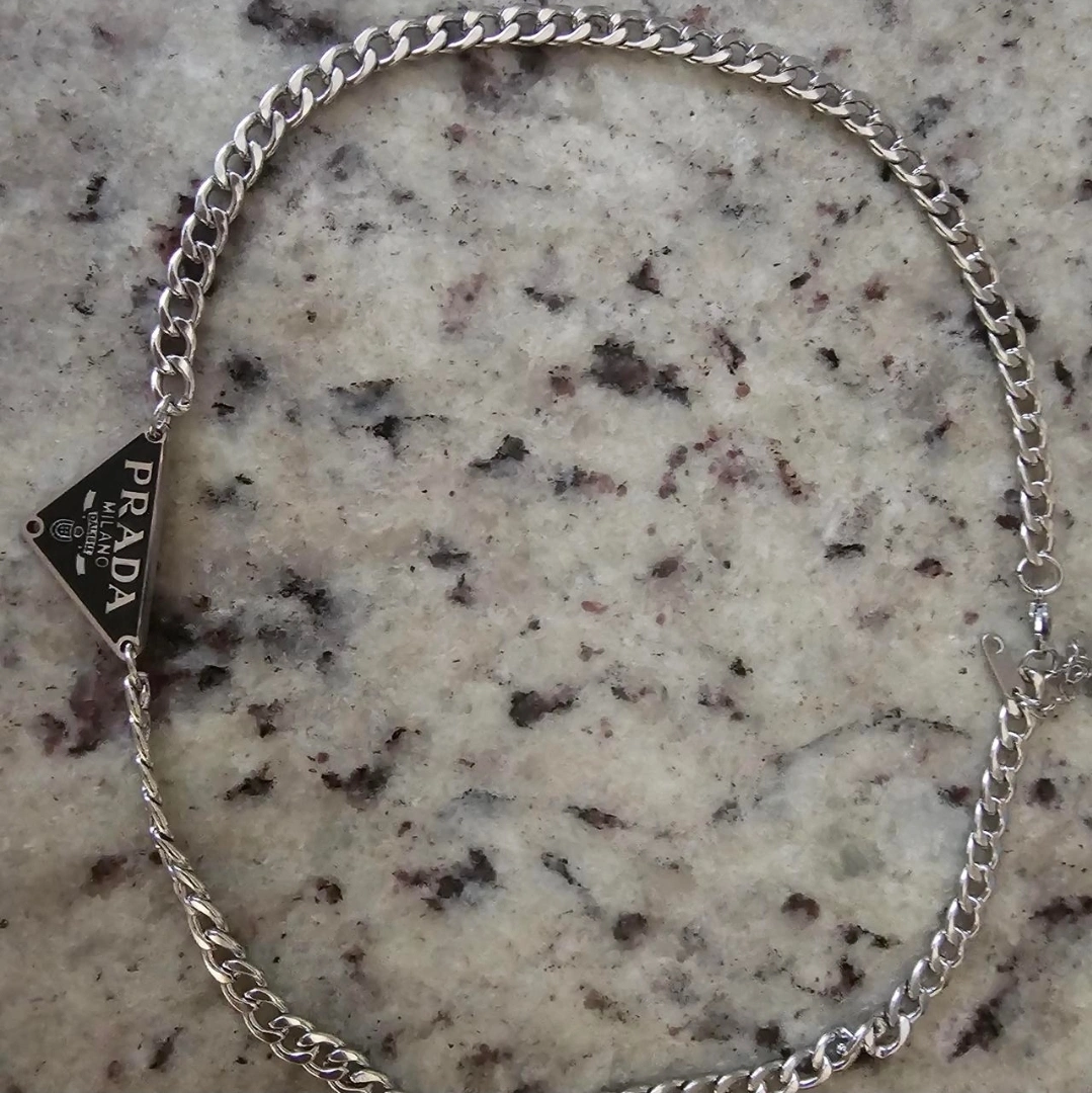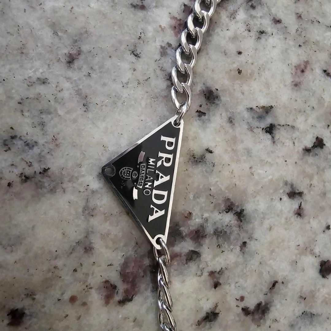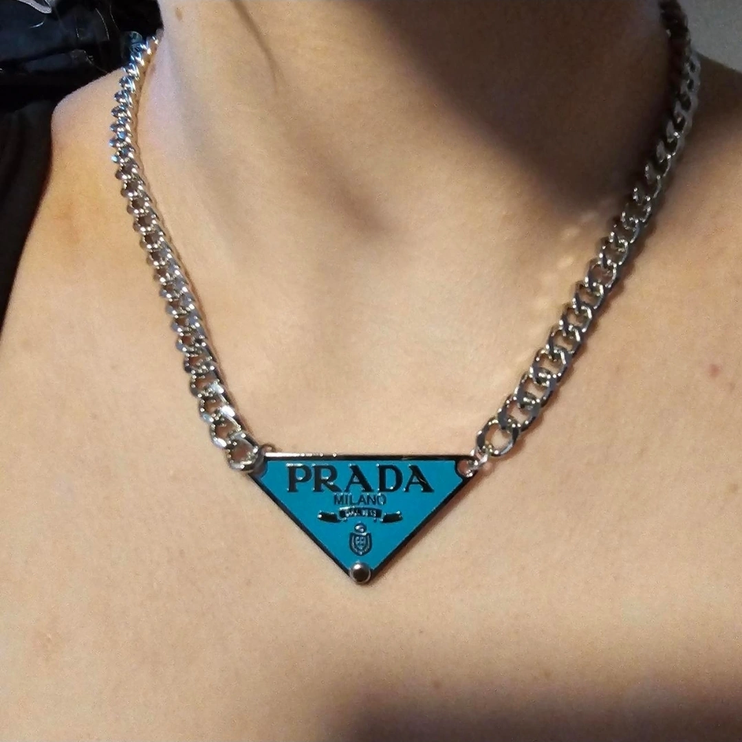This is a Prada Milano chain necklace featuring the iconic Prada triangle logo. It has a silver chain and a triangle charm. The charm is black but in the latest photos you can see how the turquoise looks on an adult woman