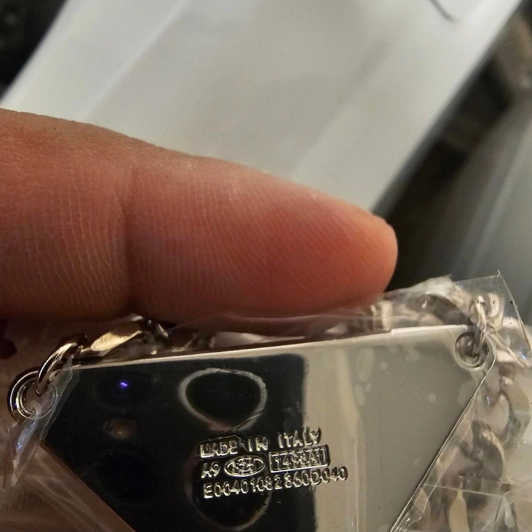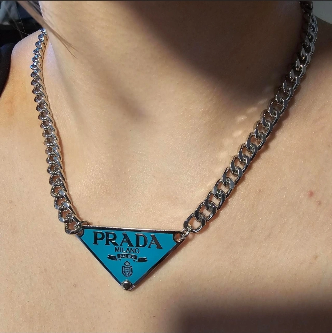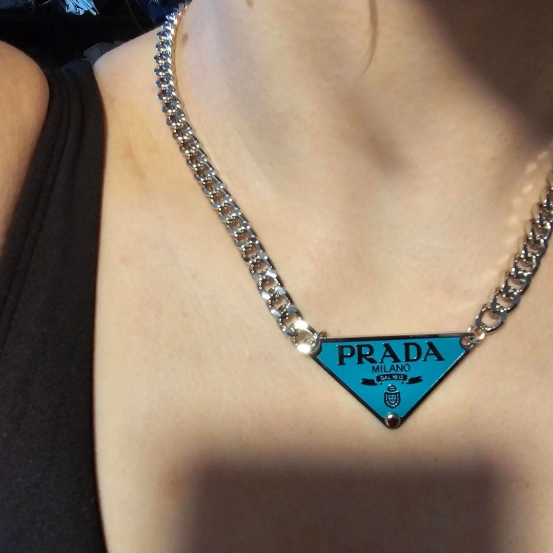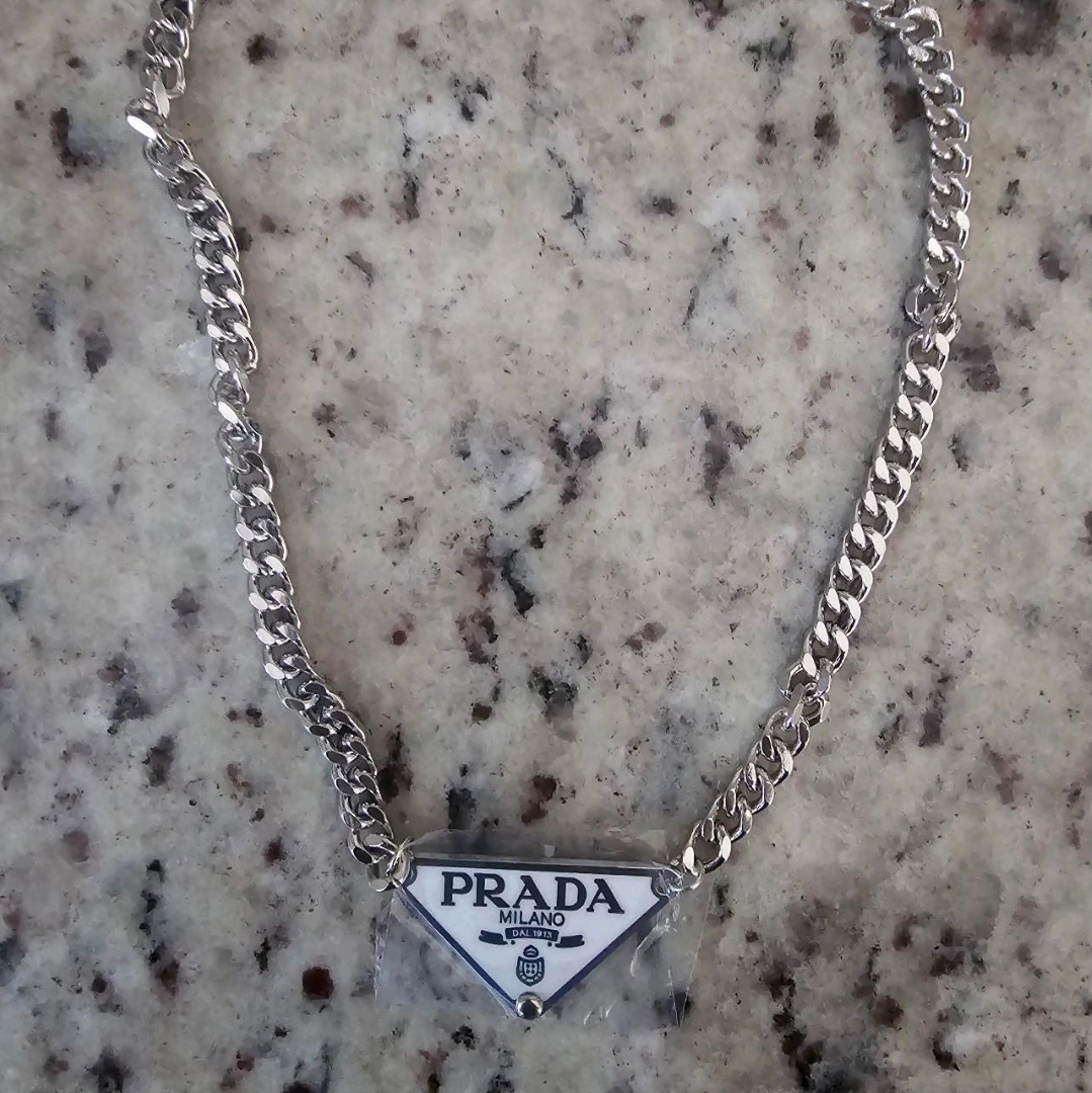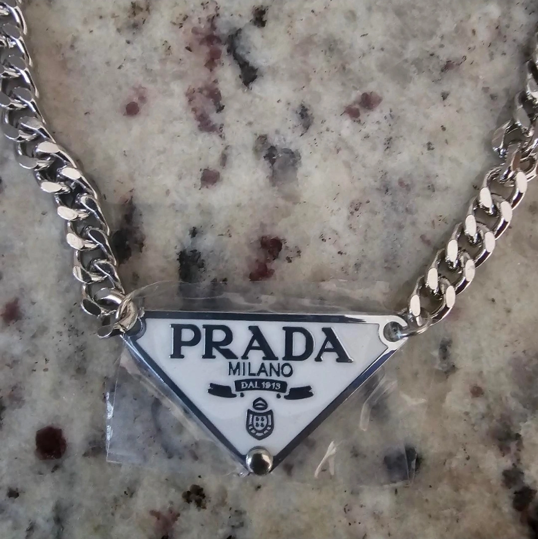 This is a Prada Milano chain necklace. It's in great condition and features the iconic Prada triangle logo. The chain is silver-toned and the pendant is a white color.
