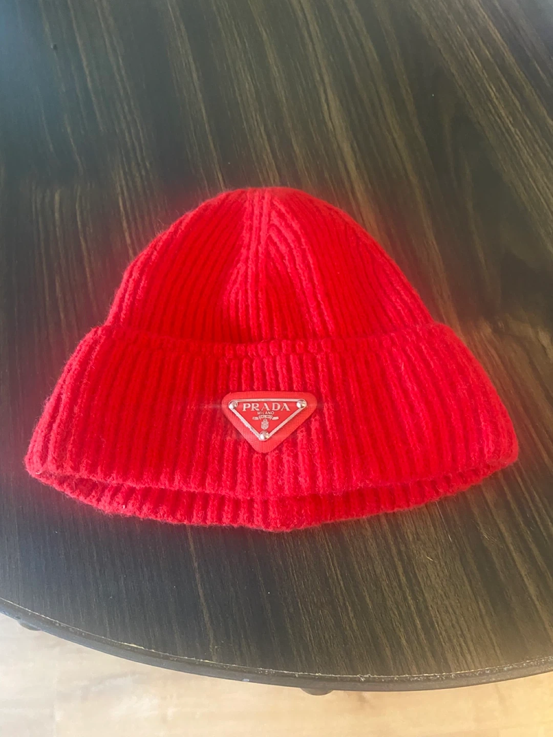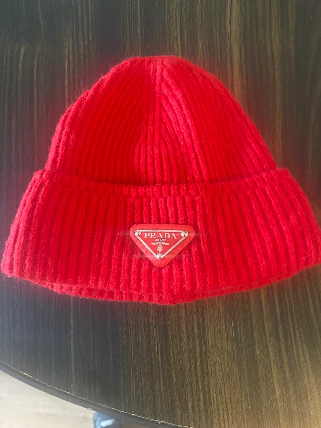 170Selling a stylish red knit beanie from Prada! The iconic Prada logo is prominently displayed on the front. This beanie is perfect for adding a pop of color to your outfit and staying warm. It's made of a comfortable knit material.