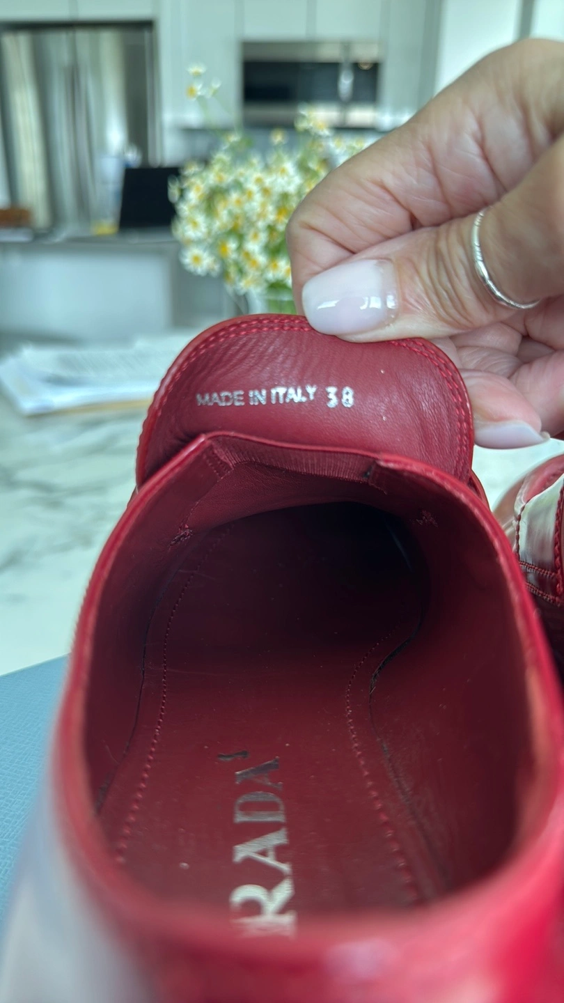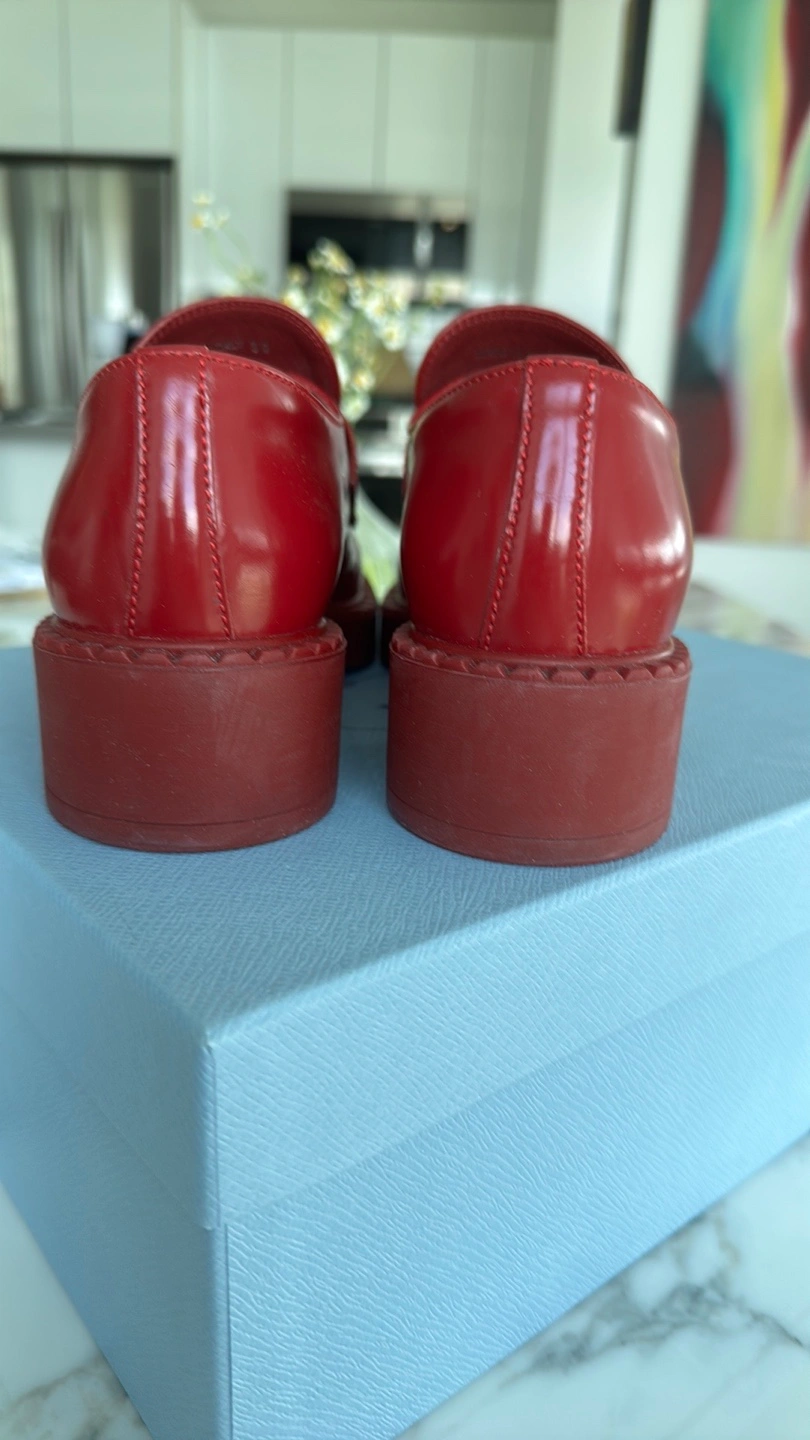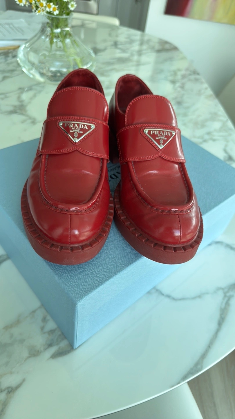 Selling a pair of Prada loafers in red leather. They are a size 38 and come with the box. These stylish shoes are perfect for adding a pop of color to your wardrobe!