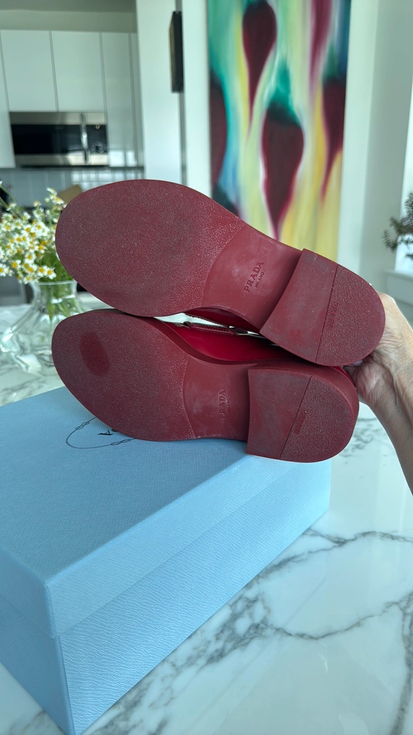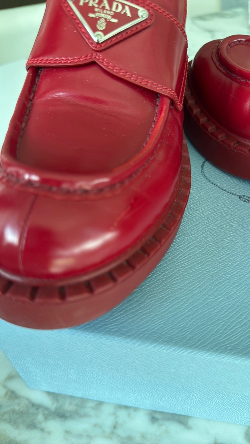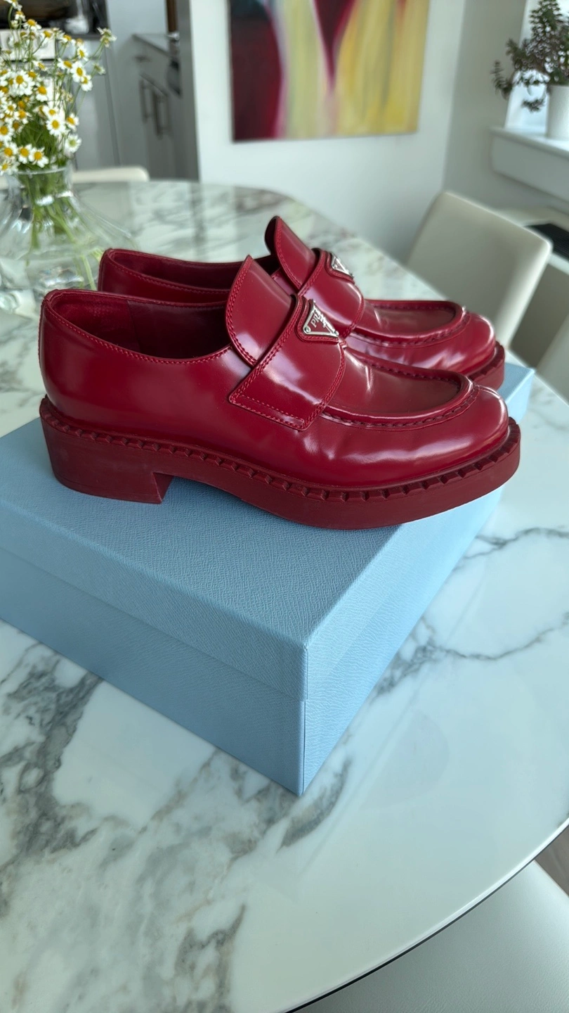 Selling a pair of Prada loafers in red leather. They are a size 38 and come with the box. These stylish shoes are perfect for adding a pop of color to your wardrobe!
