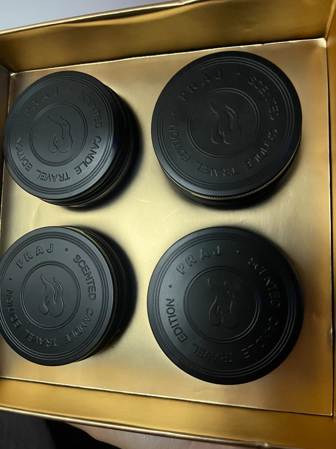 10Selling a set of PRAJ Scented Candles, perfect for travel! The set includes four candles, all in the travel edition size. They come in a beautiful black and gold box, making it a great gift or a treat for yourself