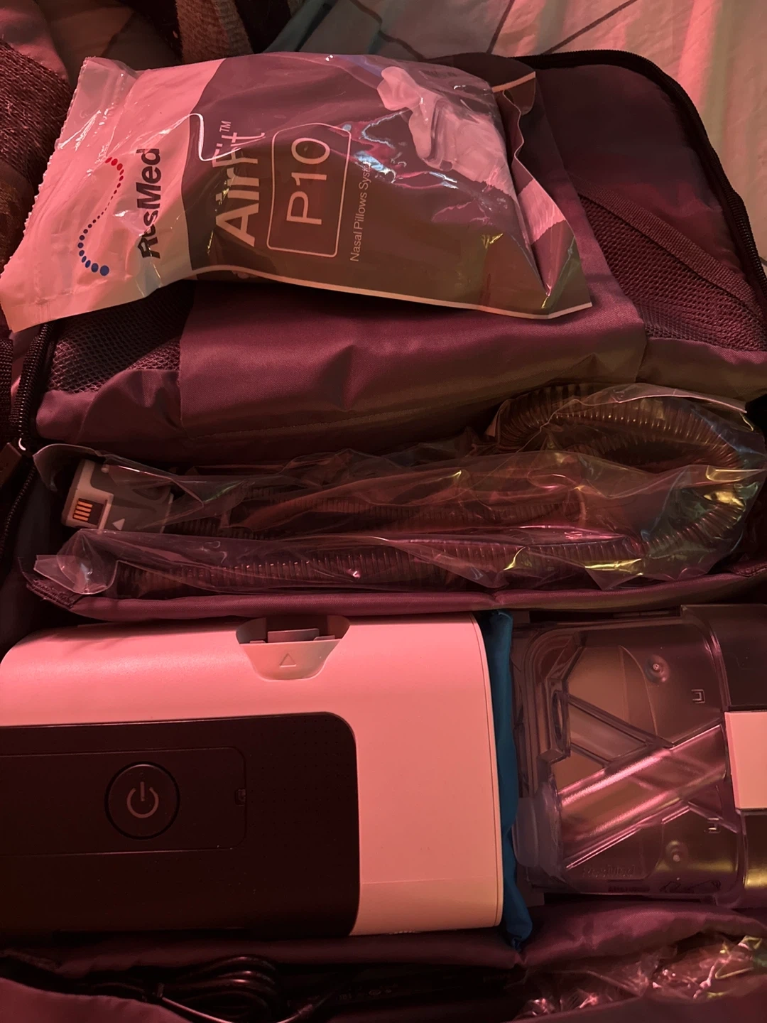 This ResMed AirSense 11 CPAP machine comes with the AirFit P10 nasal pillow system. It includes the CPAP machine, tubing, a nasal mask, and Bag