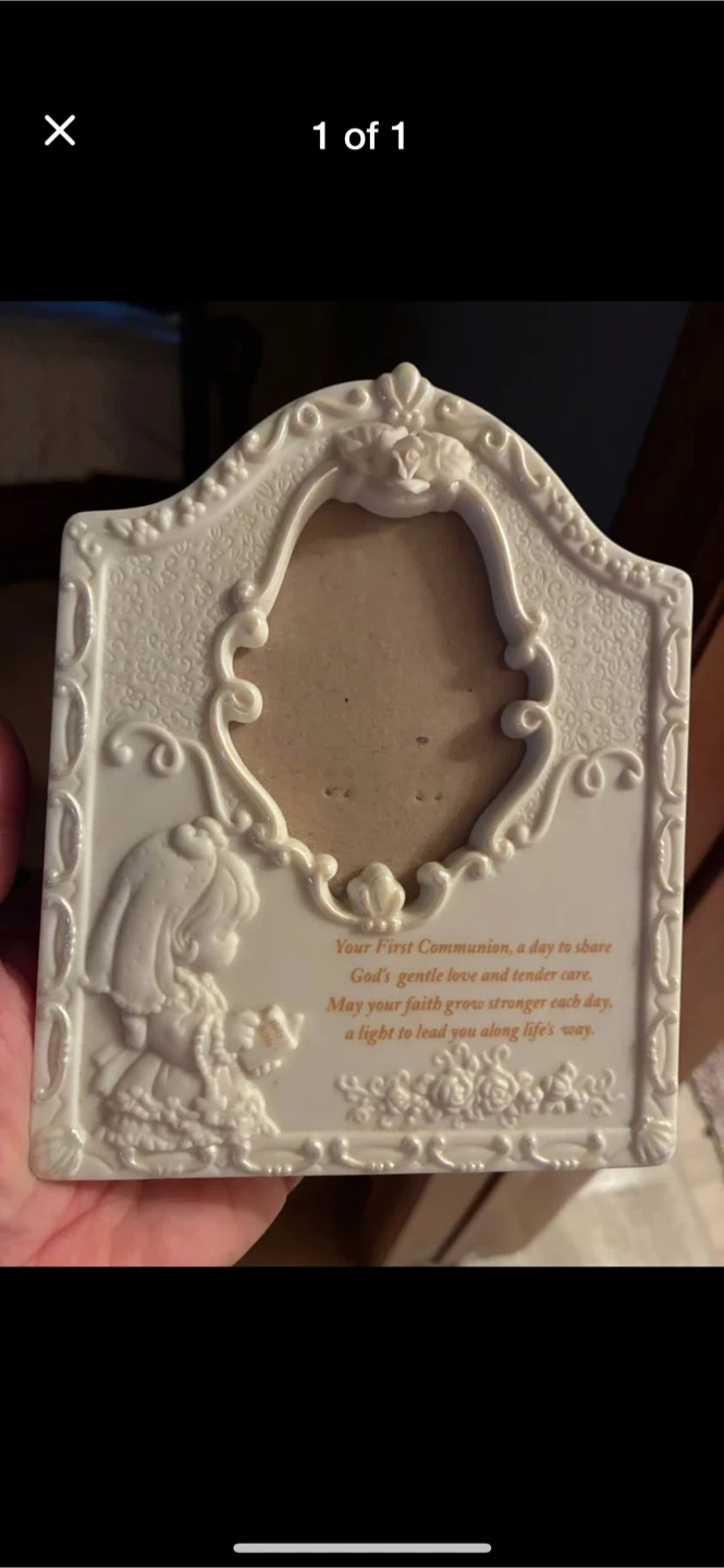This is a Precious Moments photo frame for a First Communion. It features a girl in prayer and the words, "Your First Communion, a day to share God's gentle love and tender care. May your faith grow stronger each day, a light to lead you along life's way"