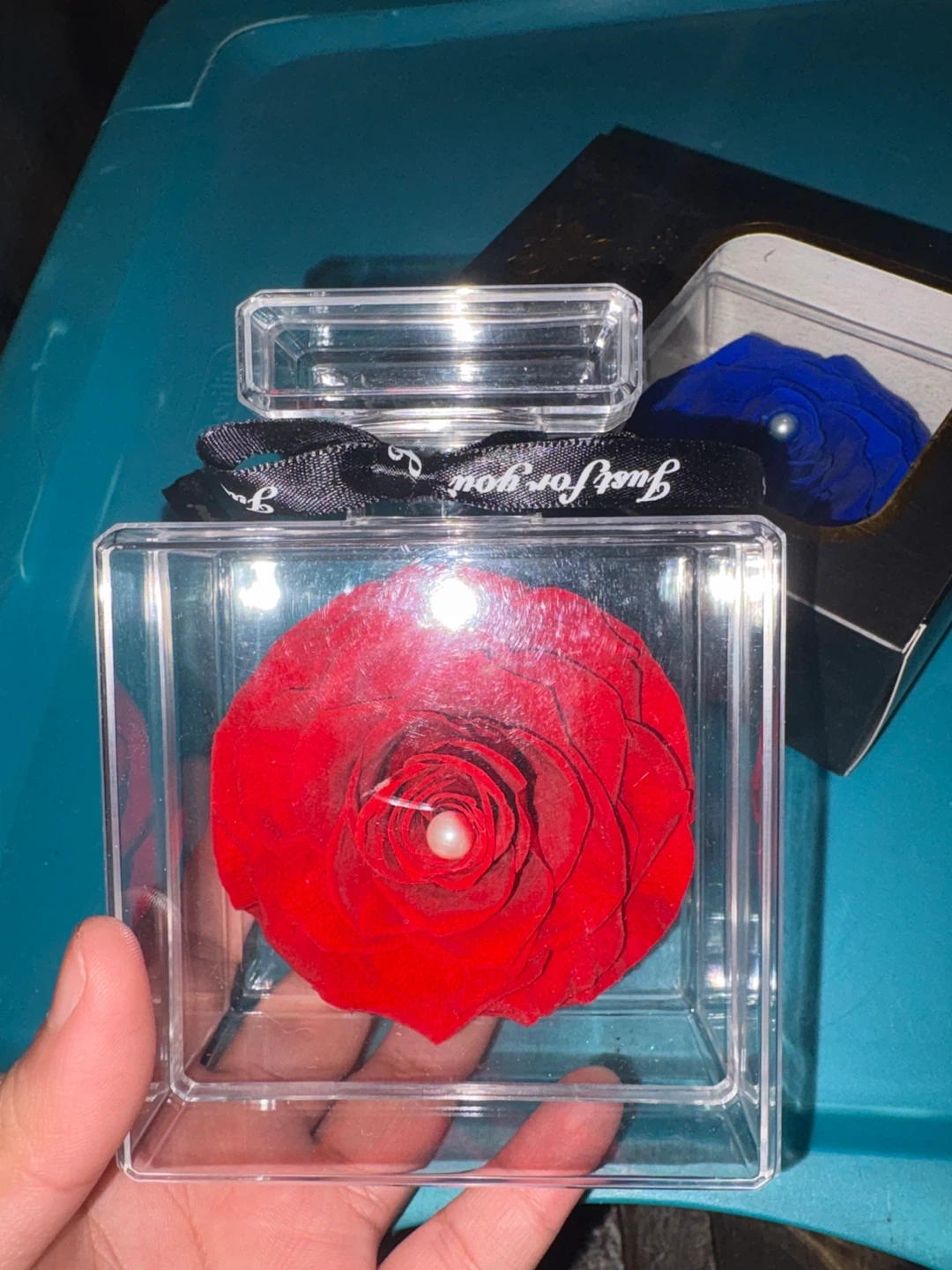 5I'm selling a preserved rose encased in a clear acrylic box. It's a beautiful and unique decorative piece! The rose is a vibrant blue color, and it has a pearl in the center. The box also has a ribbon that says "Just For You" on it. It's in great condition and would make a lovely gift or addition to your home decor