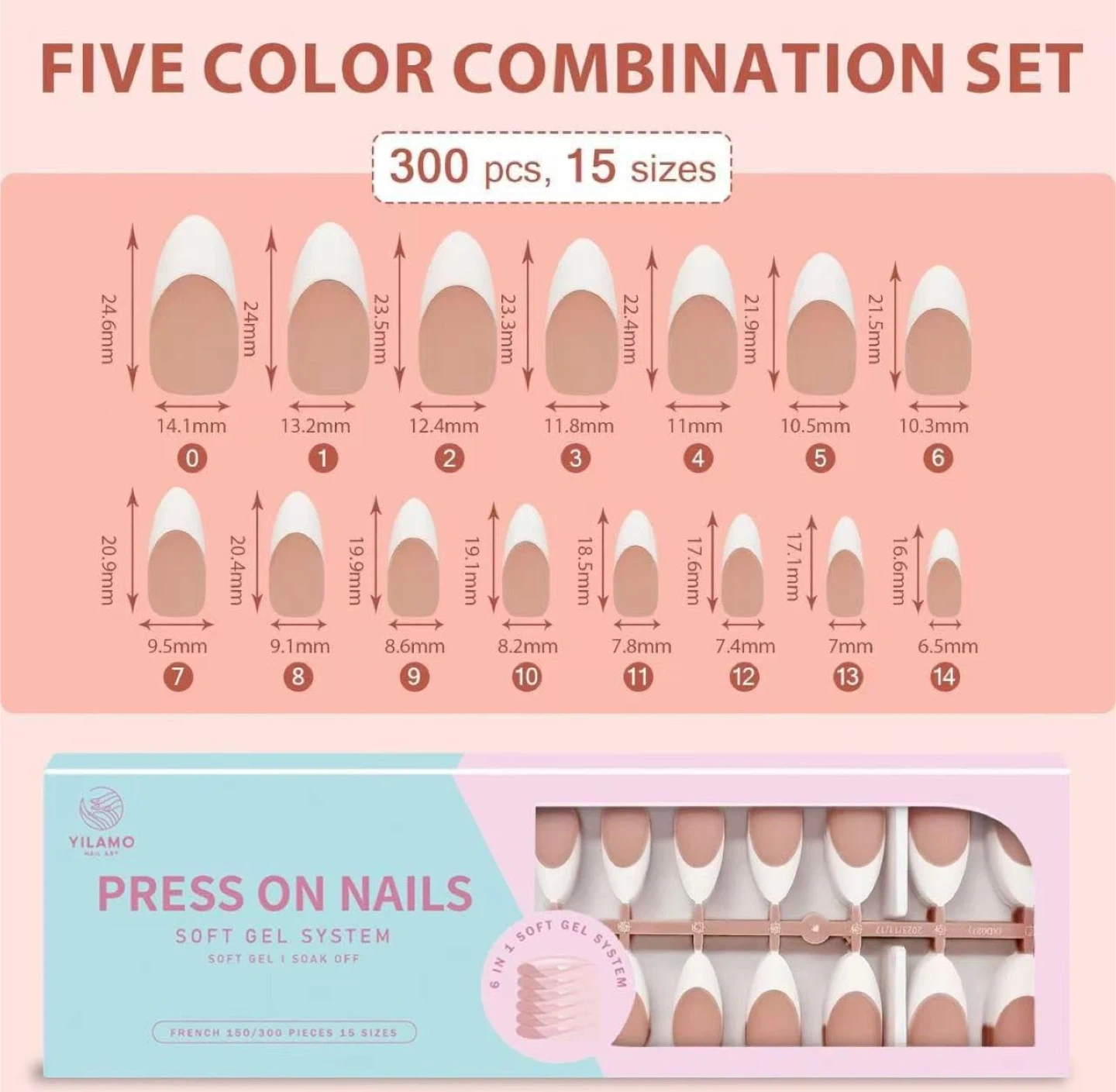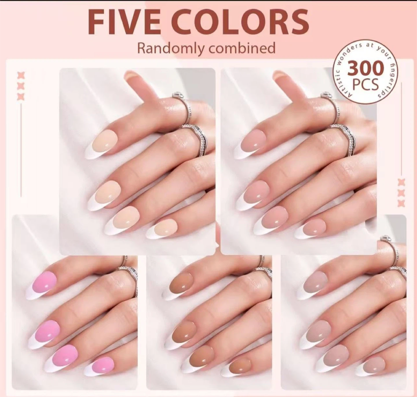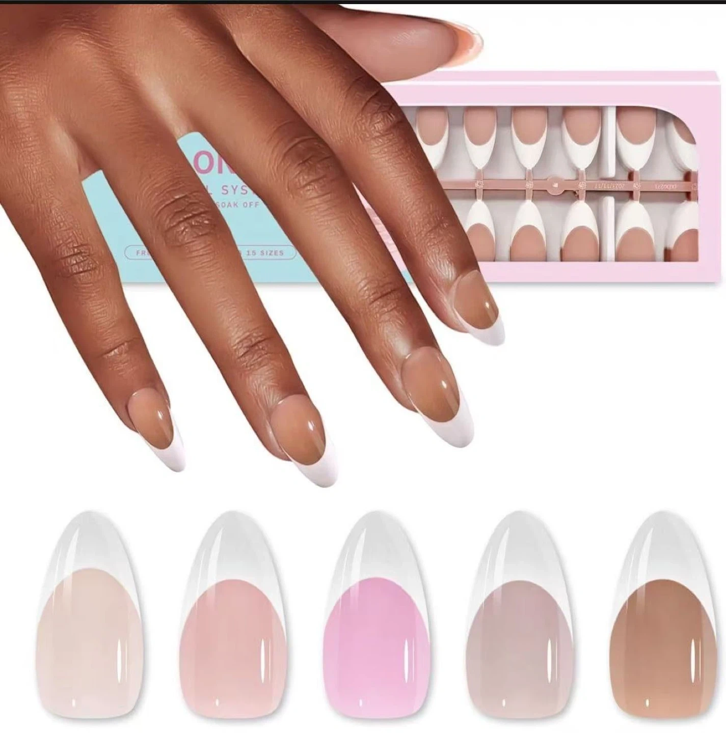 60French Gel Nail Tips - Press on Nails Pink Medium Almond Pre-applied Tip Primer & Base Coat, No Need to File Fake Nails for Nail Art DIY Gifts,Five Colors,15 Sizes