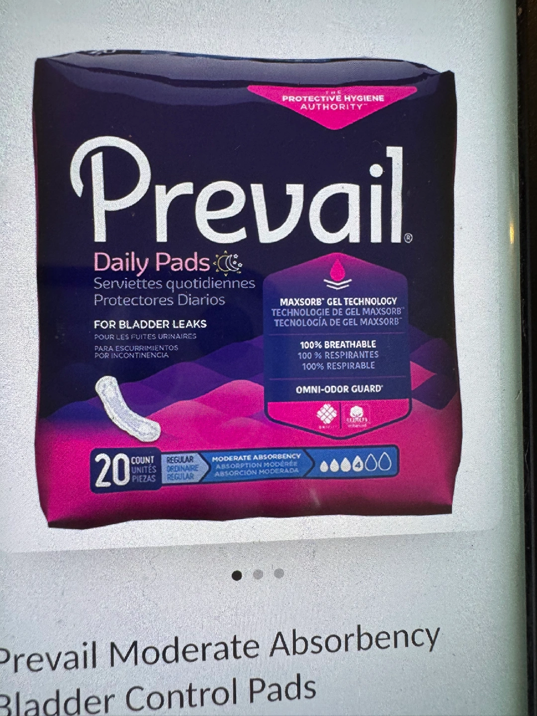 I'm selling a package of Prevail Daily Pads for bladder leaks. These are the moderate absorbency pads, and there are 20 in the package. They feature MaxSorb Gel Technology and Omni-Odor Guard, and are 100% breathable