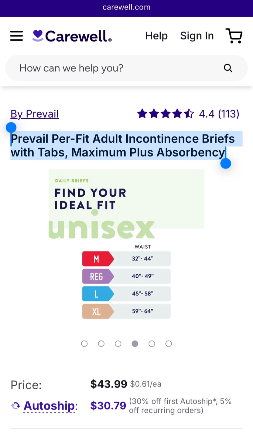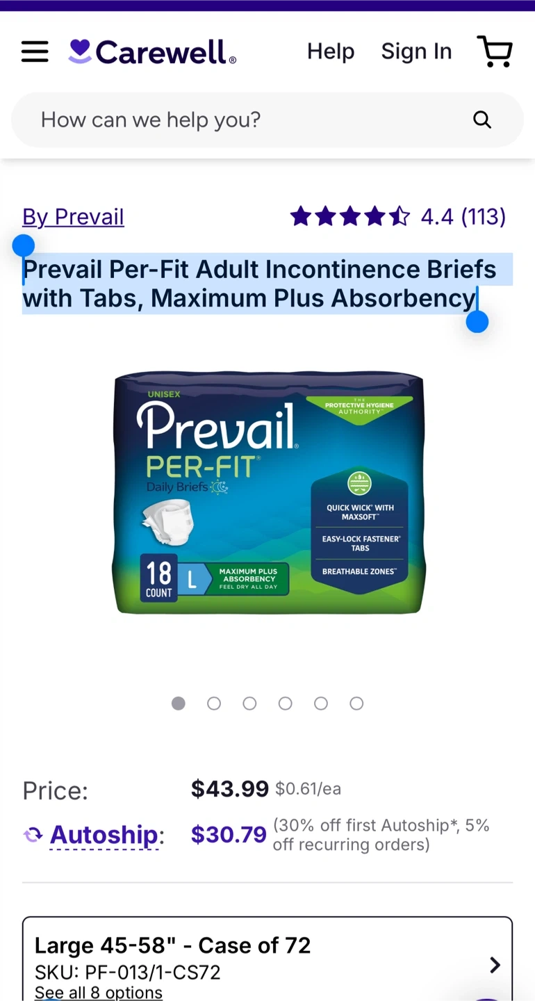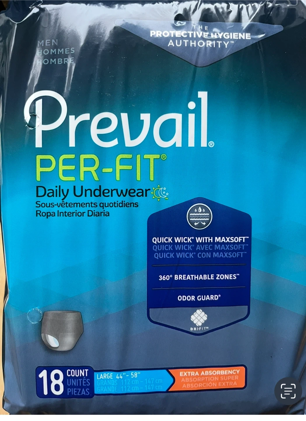 Selling a pack of Prevail Per-Fit adult incontinence briefs with tabs. They offer maximum plus absorbency and are size Large (45-58"). They feature a quick wick layer with Maxsoft and 360 degree breathable zones for comfort