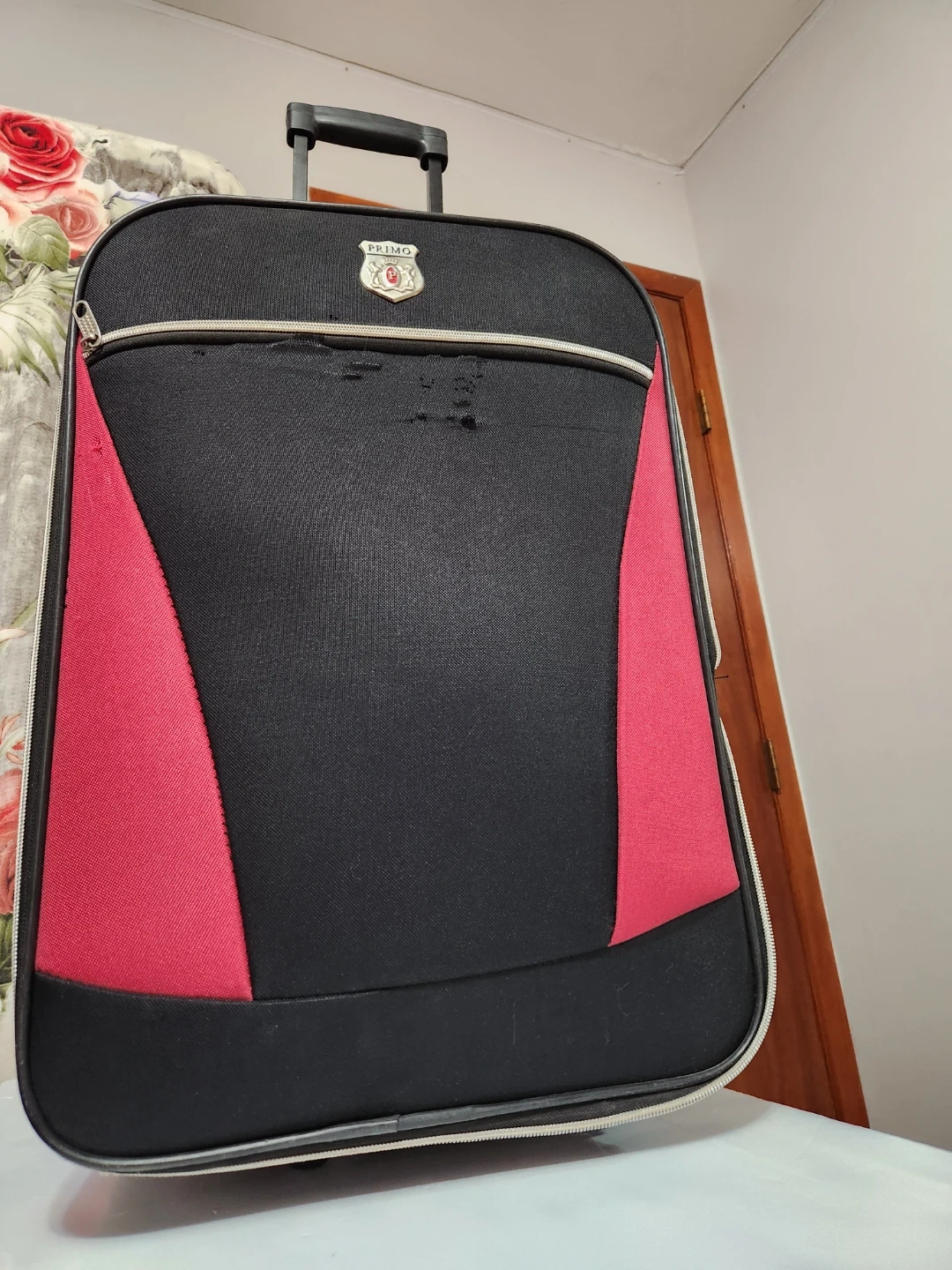 10Selling a used PRIMO rolling suitcase in black and red. It has a retractable handle and wheels for easy transport. Perfect for travel!