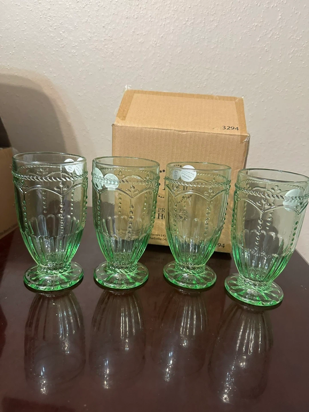 Selling a set of four Princess House Marbella glasses in green. They come with the original box!