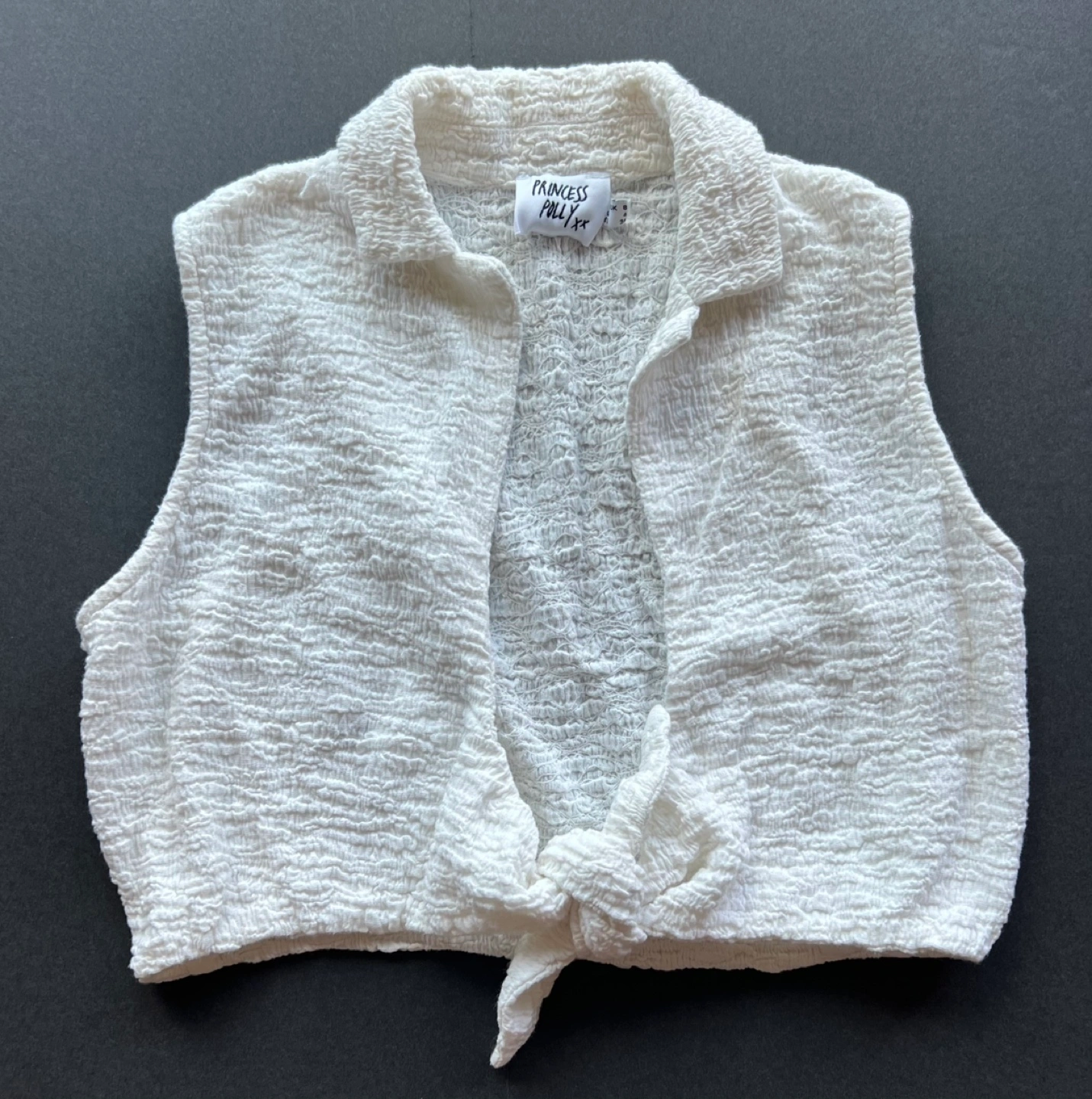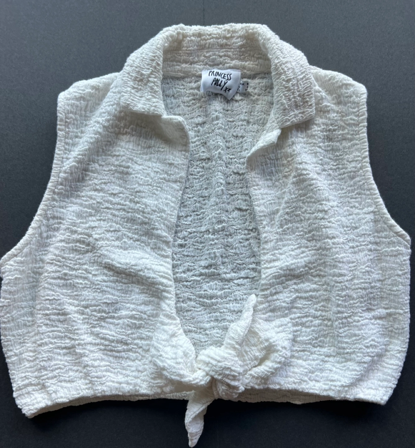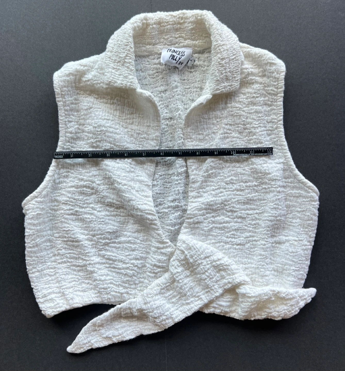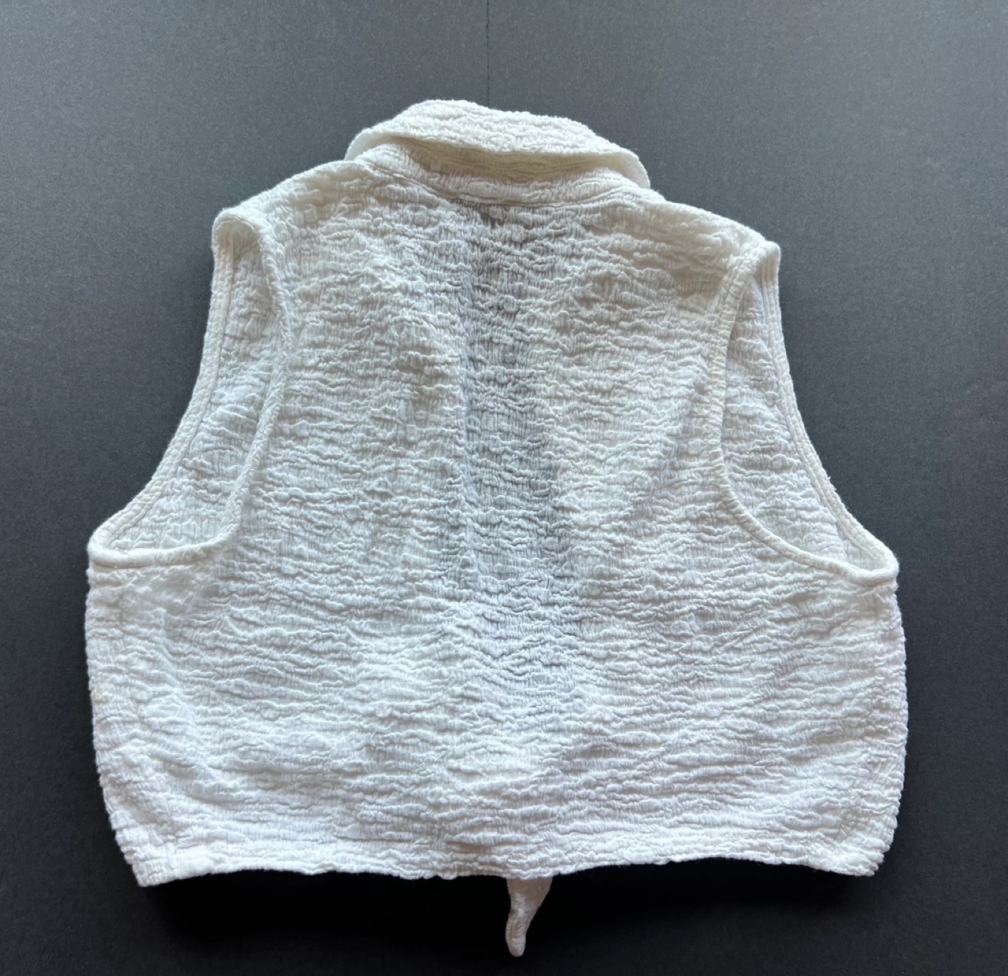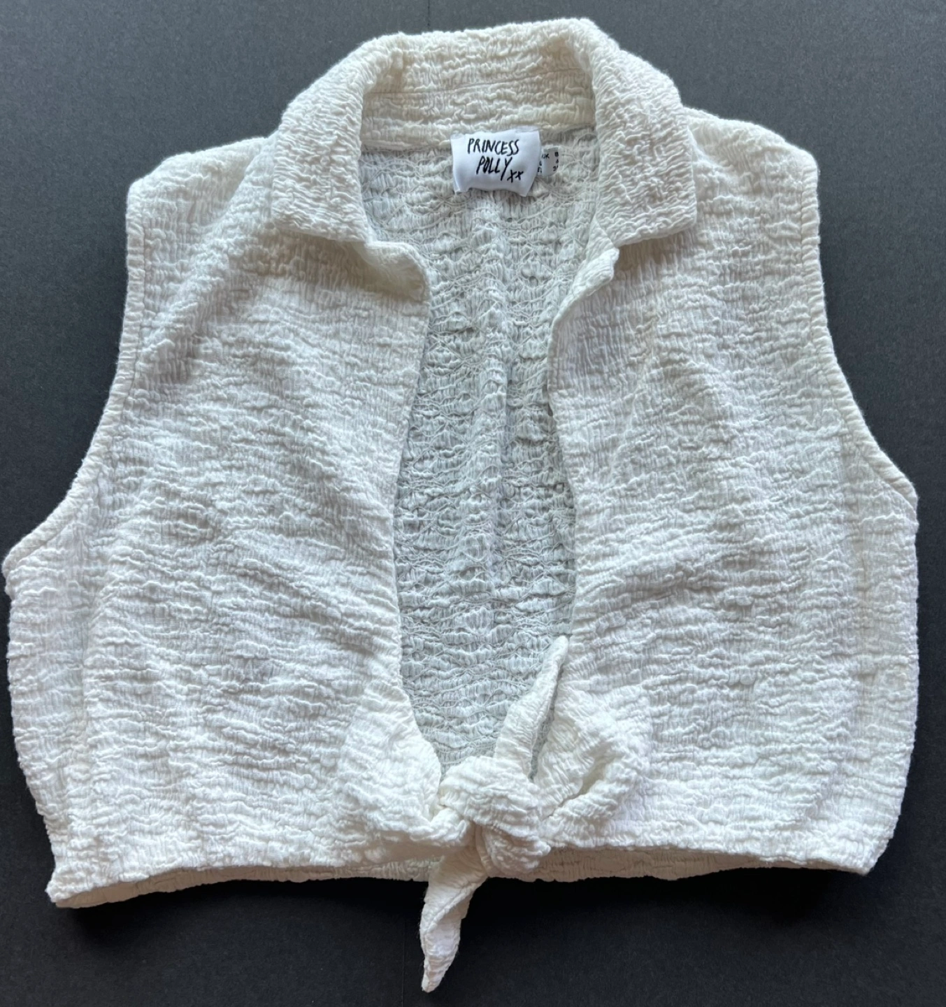 205White sleeveless crop top. Tie front detail. Collared neckline. Textured fabric. Selling this copy style women’s crop vest shown. In used condition but great condition. Size is women’s size 4. (Women’s small)