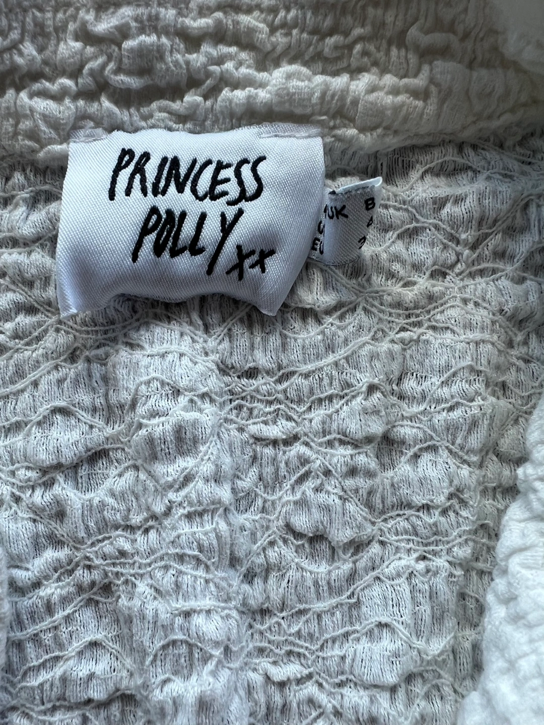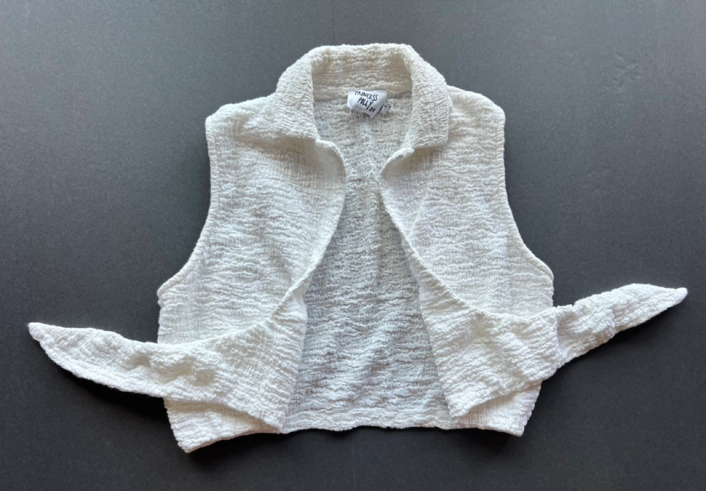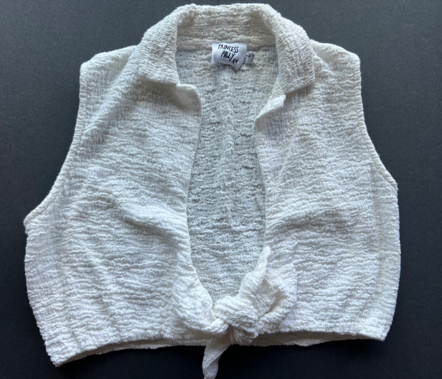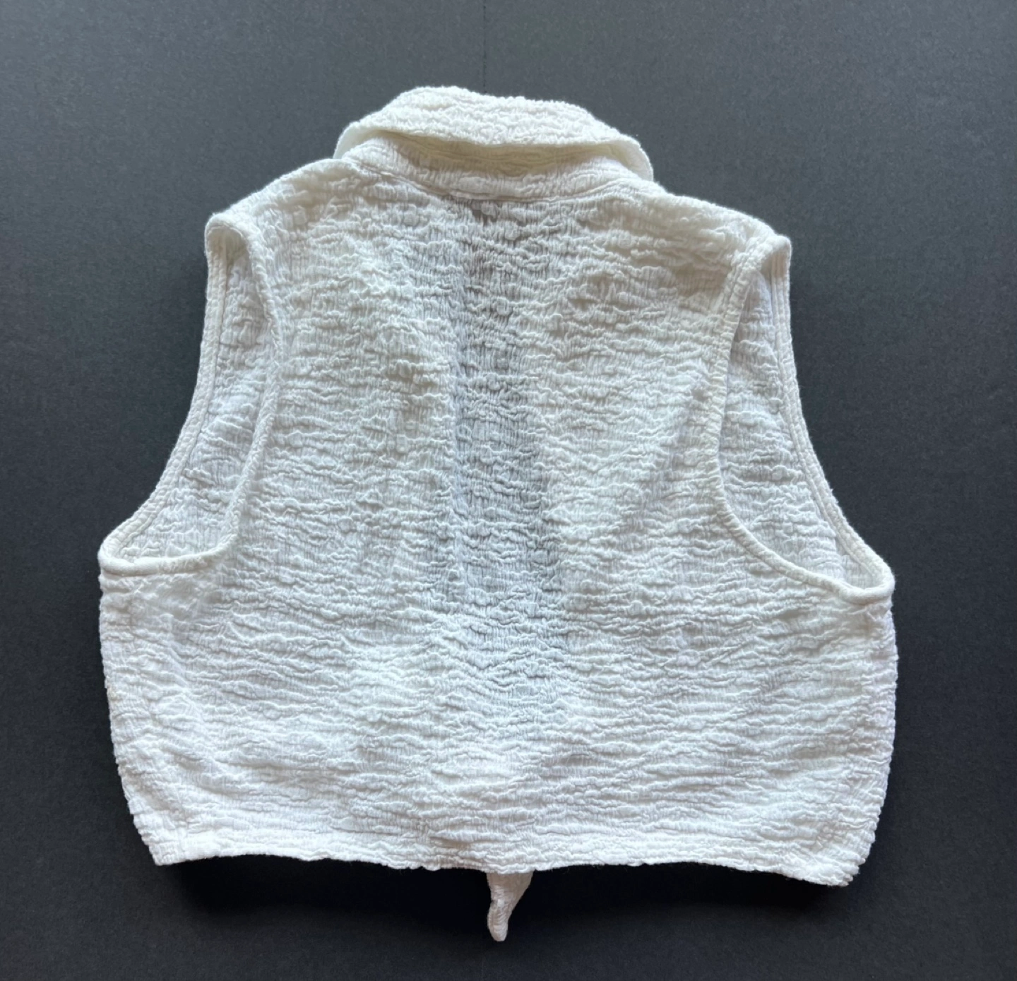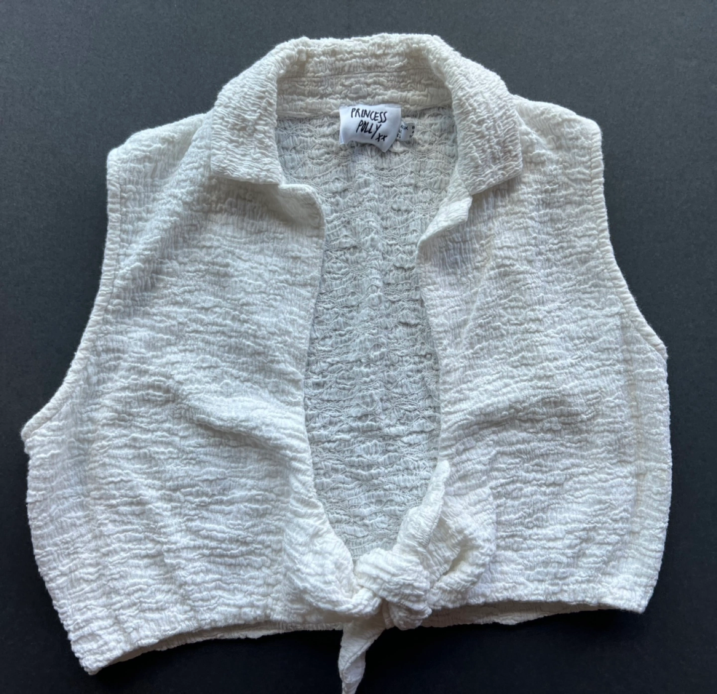 205White sleeveless crop top. Tie front detail. Collared neckline. Textured fabric. Selling this copy style women’s crop vest shown. In used condition but great condition. Size is women’s size 4. (Women’s small)