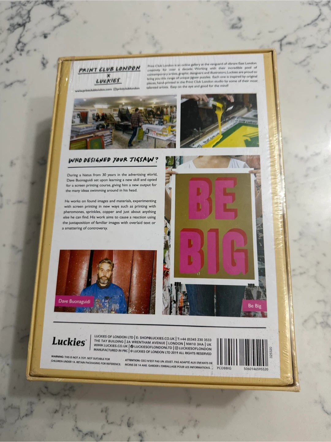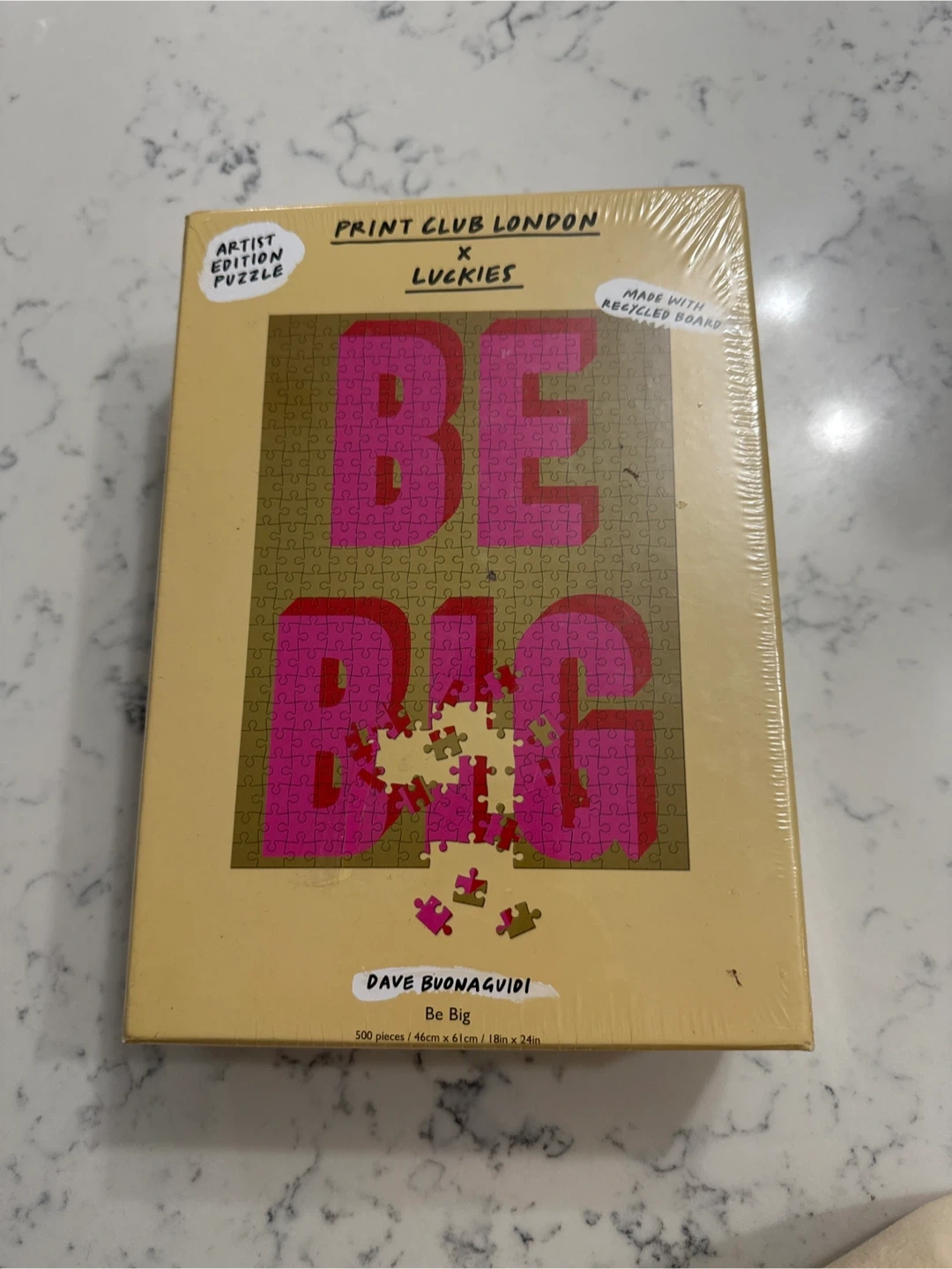 65Selling a Print Club London x Luckies artist edition puzzle called 'Be Big' by Dave Buonaguidi. It's made with recycled board and contains 500 pieces. The puzzle's dimensions are 46cm x 61cm, which is about 18in x 24in