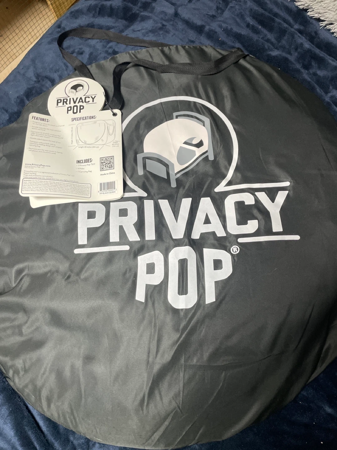 60Selling a Privacy Pop bed tent designed for queen size beds. It's black and comes with the tent, poles, and carrying bag. It's designed for easy setup and takedown, with durable style that fits most common queen size beds. It also has innovative zip & mesh windows for easy breathing and light, double sided zippers, and an electronic port for laptop, cell phone, and electronic cords