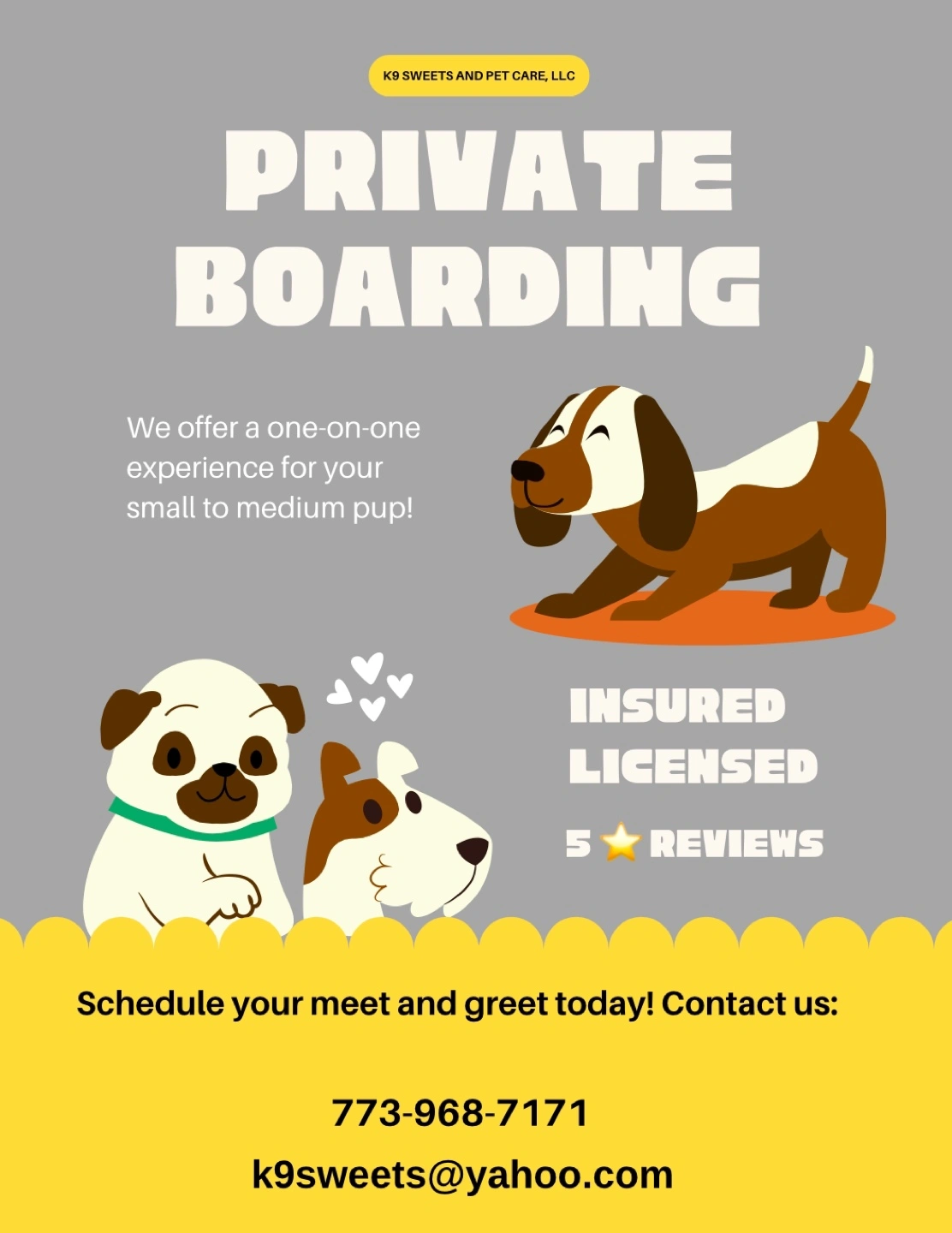 Hey Pawrents! I'm thrilled to offer loving and reliable boarding in my cozy Humboldt Park home! 💖 I’m the only licensed and insured small business in Chicago that offers private services. 🐾🥰I offer private boarding, meaning your beloved small-to-medium-sized pup will get all my attention! 🐕 No overcrowded kennels here—just individualized care and lots of love, and cuddles. Visit our website for full details. K9sweets.wixsite.com/k9sweets