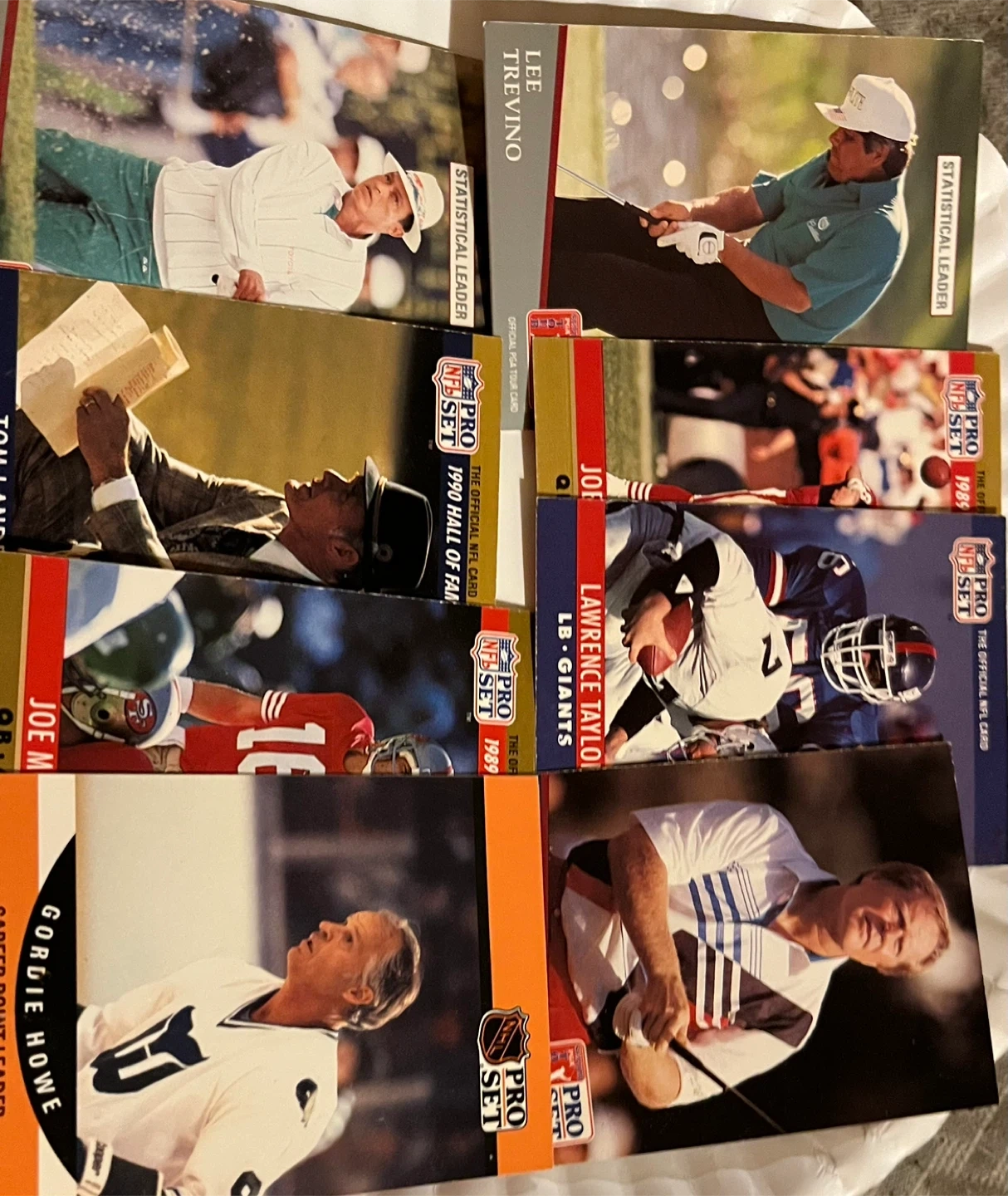 15Selling a collection of Pro Set NFL and NHL trading cards. Includes players like Lee Trevino, Lawrence Taylor, Joe Montana, and Gordie Howe. These cards are from the late 1980s and early 1990s. Great for any sports card collector!