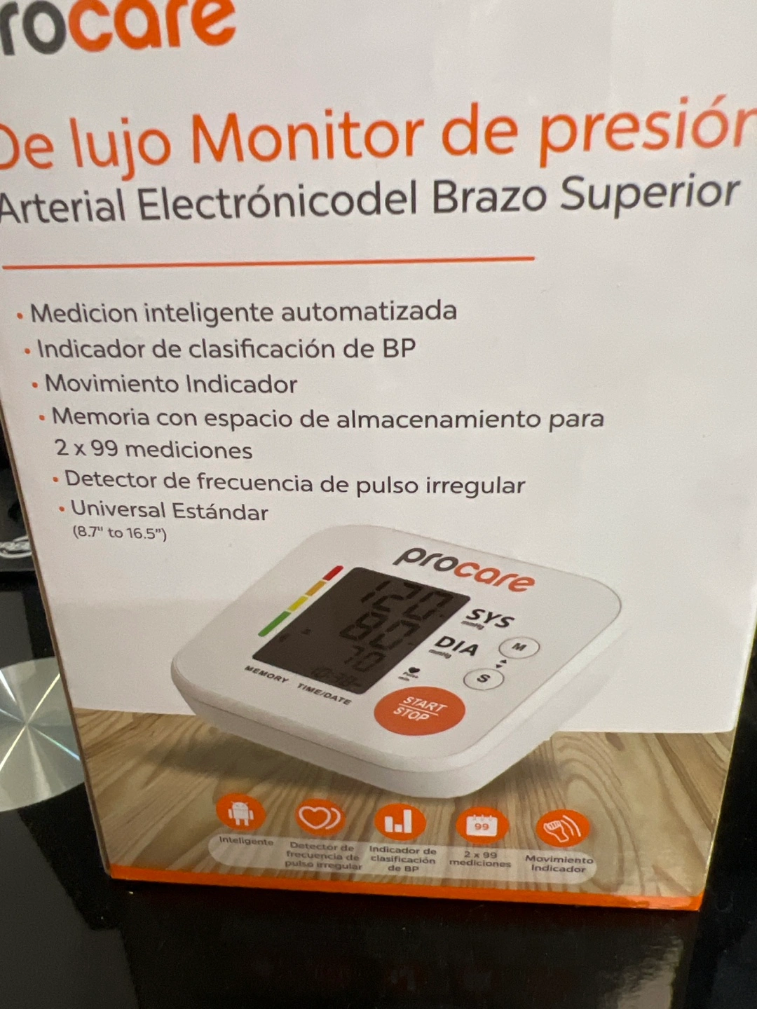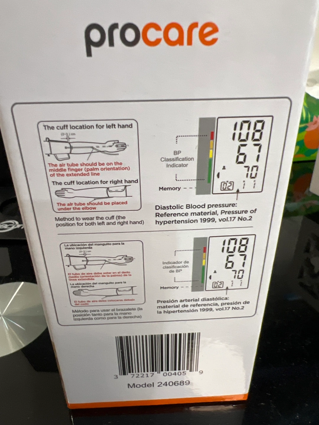 Selling a Procare blood pressure monitor. It is an automatic intelligent measurement device with a BP classification indicator and movement indicator. It has memory storage space for 2 x 99 measurements and a pulse frequency detector. Model 240689