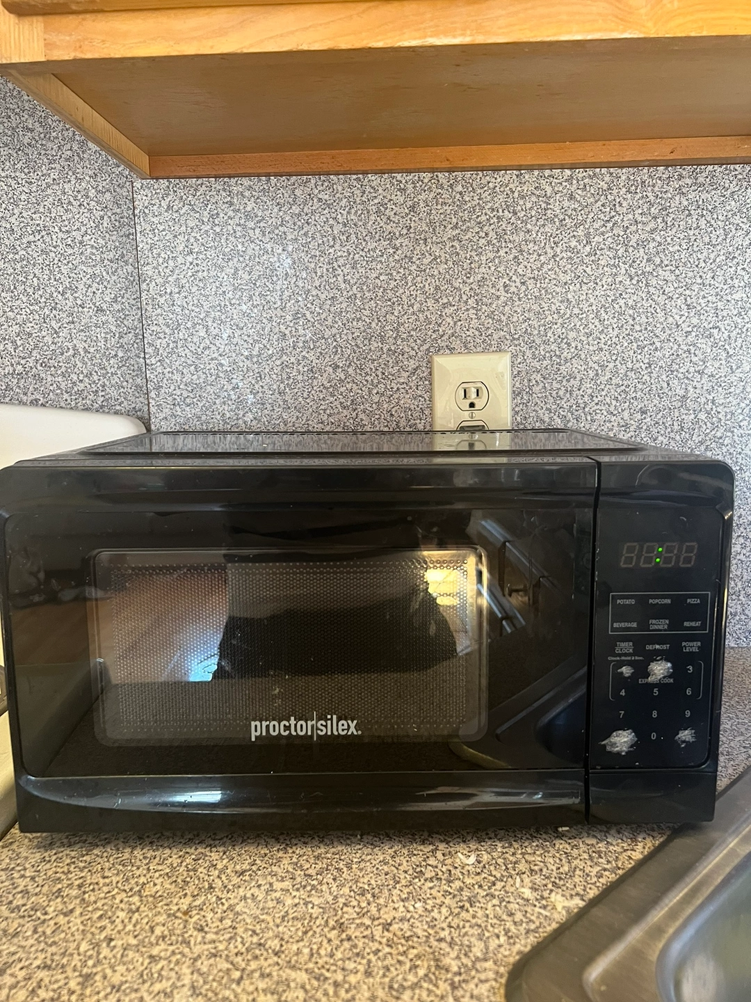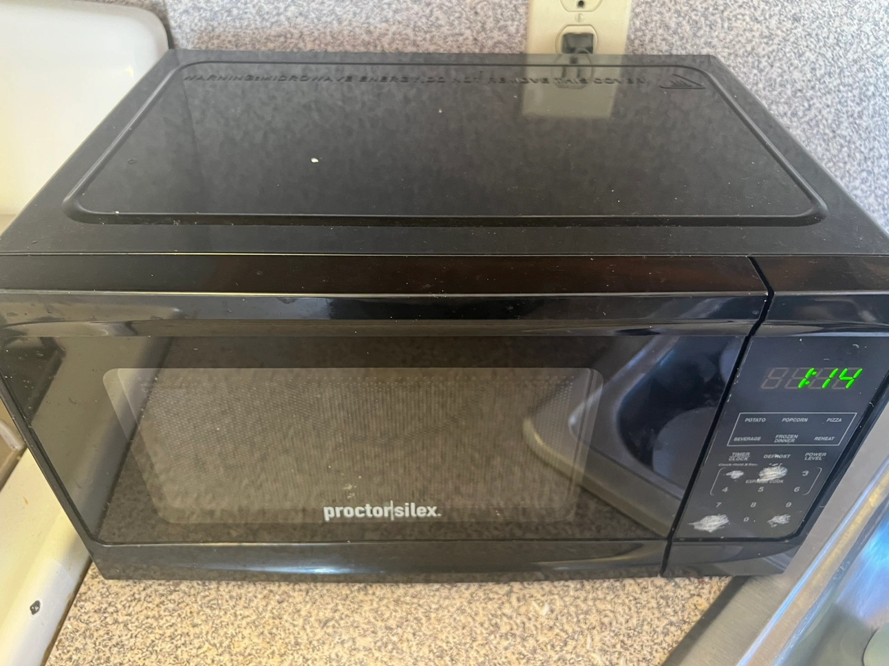 Black microwave. Has a digital display and multiple settings. Includes a turntable.