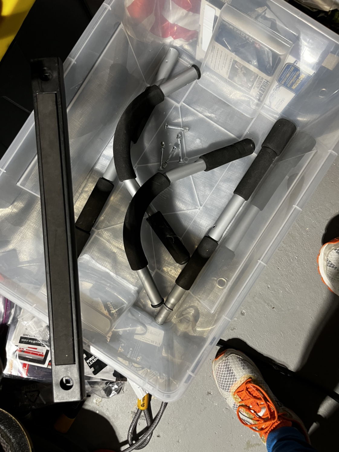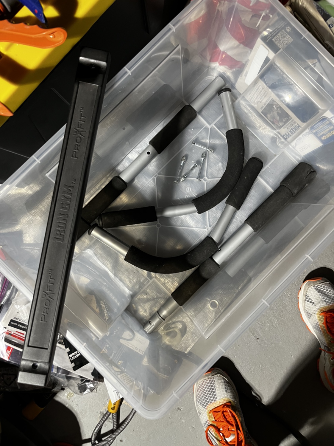 ProFit Home Gym Pull Up Bar, comes with all necessary hardware. Has wear and tear, a few creases and a split in the foam, but is still usable.