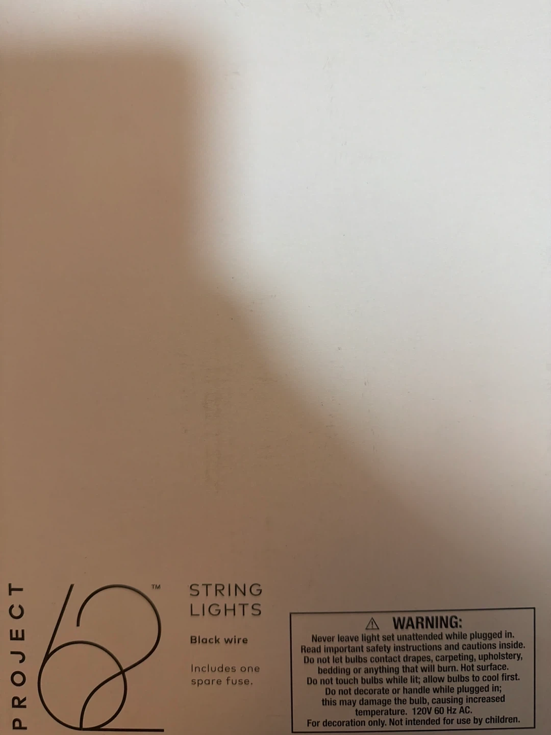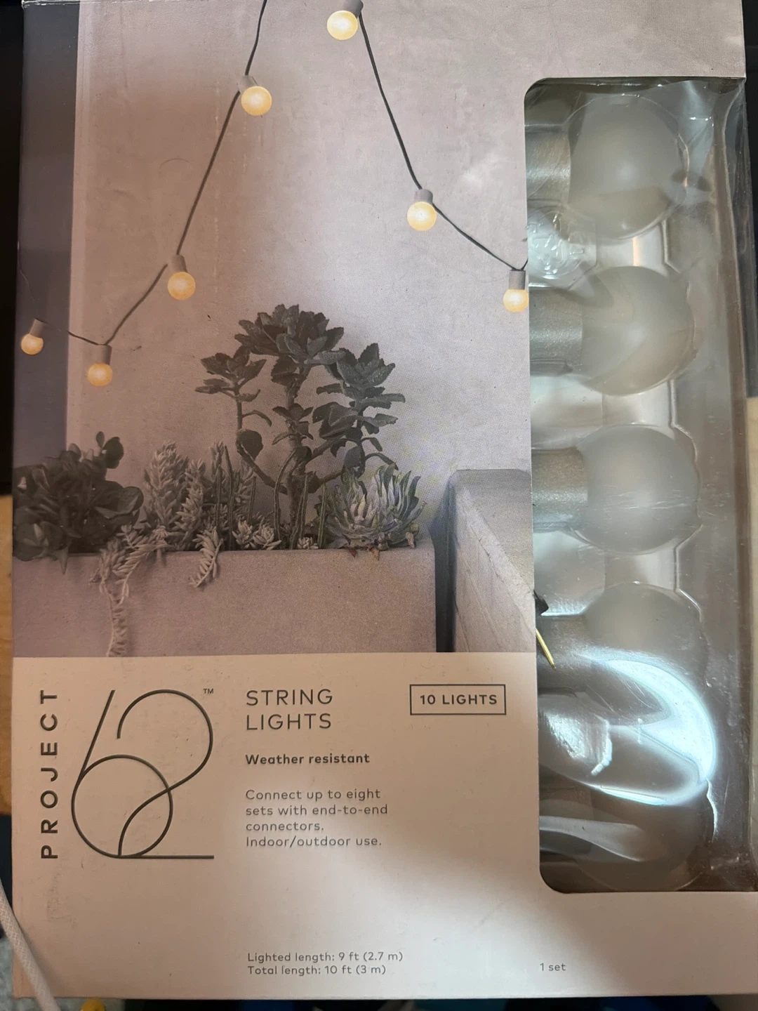 I'm selling a set of Project 62 string lights! They are weather resistant and can connect up to eight sets with end-to-end connectors. They are suitable for indoor and outdoor use. The lighted length is 9 ft (2.7 m) and the total length is 10 ft (3 m). Includes one spare fuse