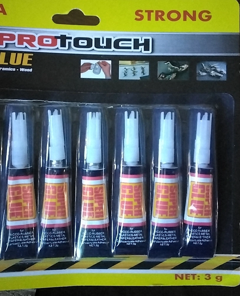 Selling a pack of Protouch Super Glue. This package contains 6 individual tubes of super glue, each with a net weight of 3g. Perfect for various materials like wood, rubber, plastics, metal, paper, and leather