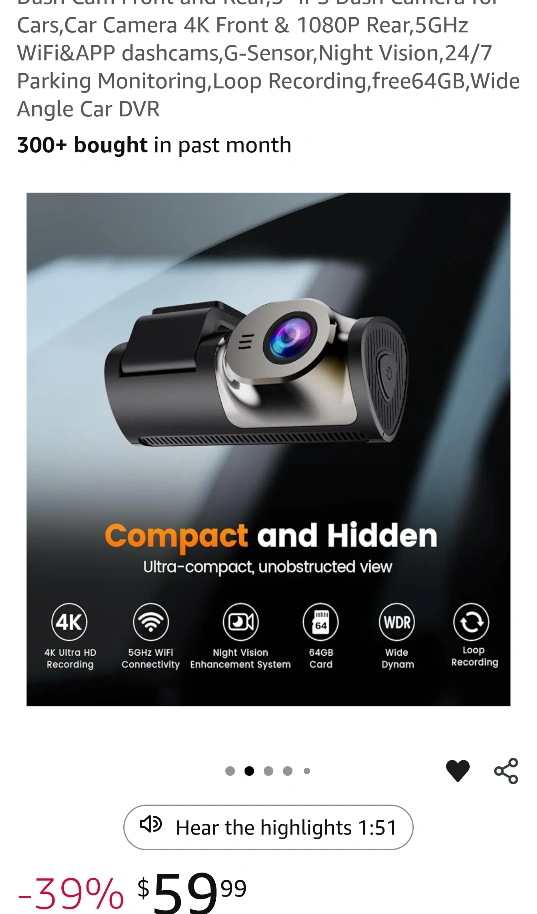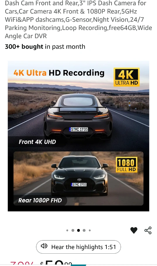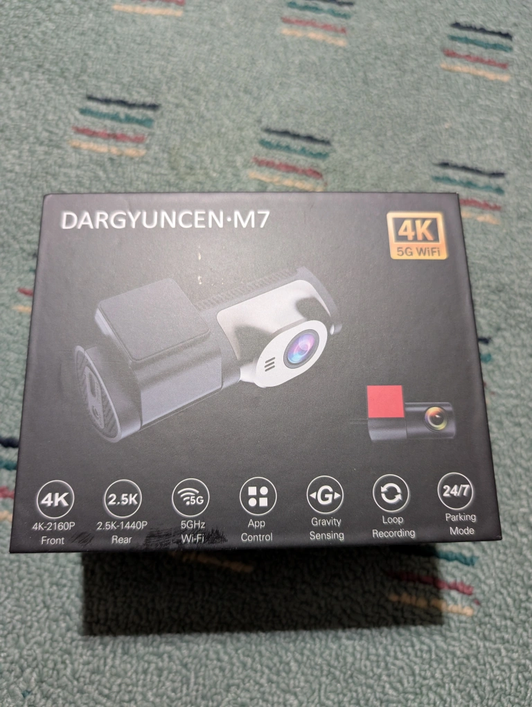 Selling a brand new Dargyuncen M7 Dual Lens Angle Car DVR, still in its original box! This dash cam features 4K Ultra HD recording for the front and 2.5K-1440P for the rear. It's equipped with 5GHz Wi-Fi, app control, gravity sensing, loop recording, and 24/7 parking mode. The box includes the dash cam and all original components