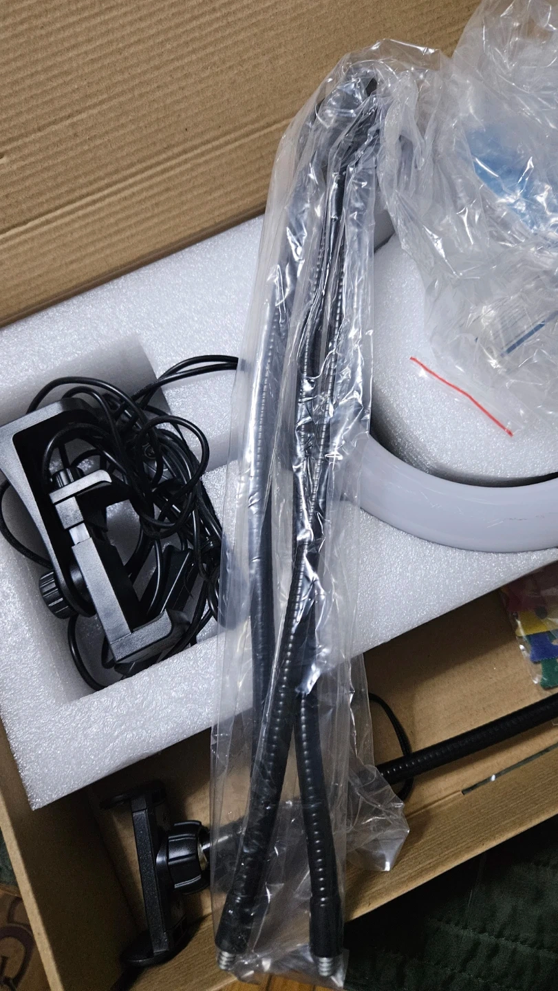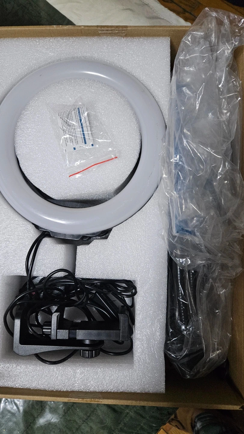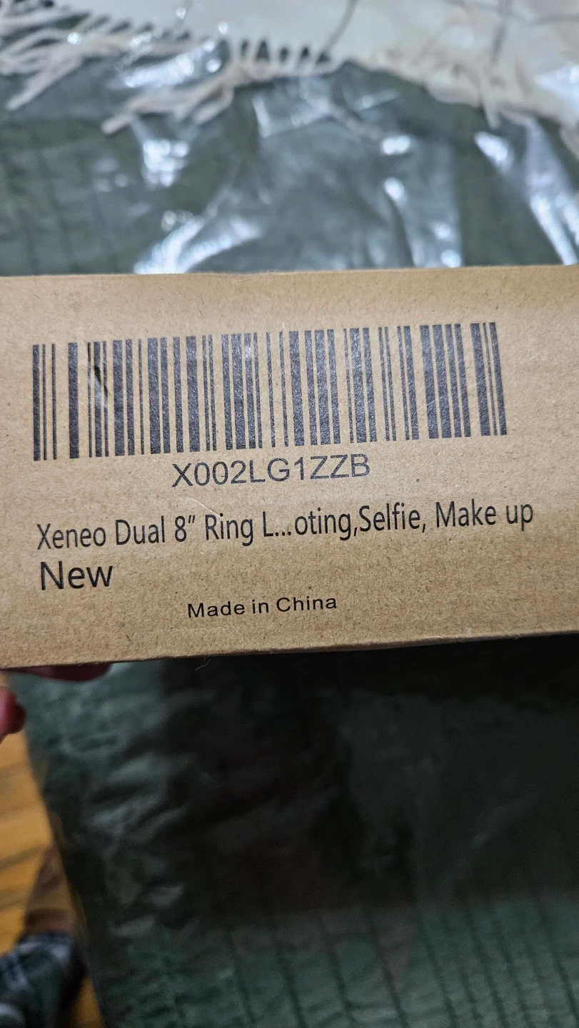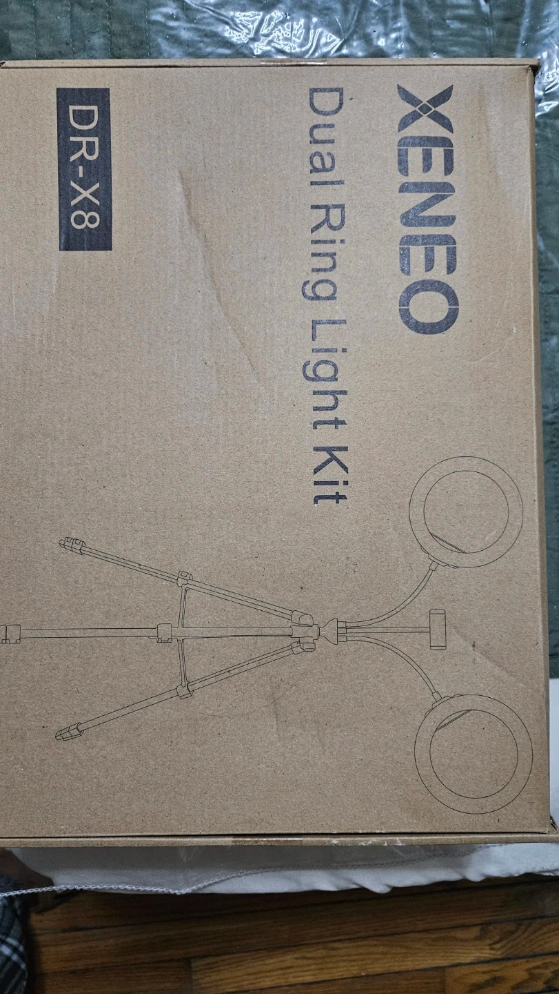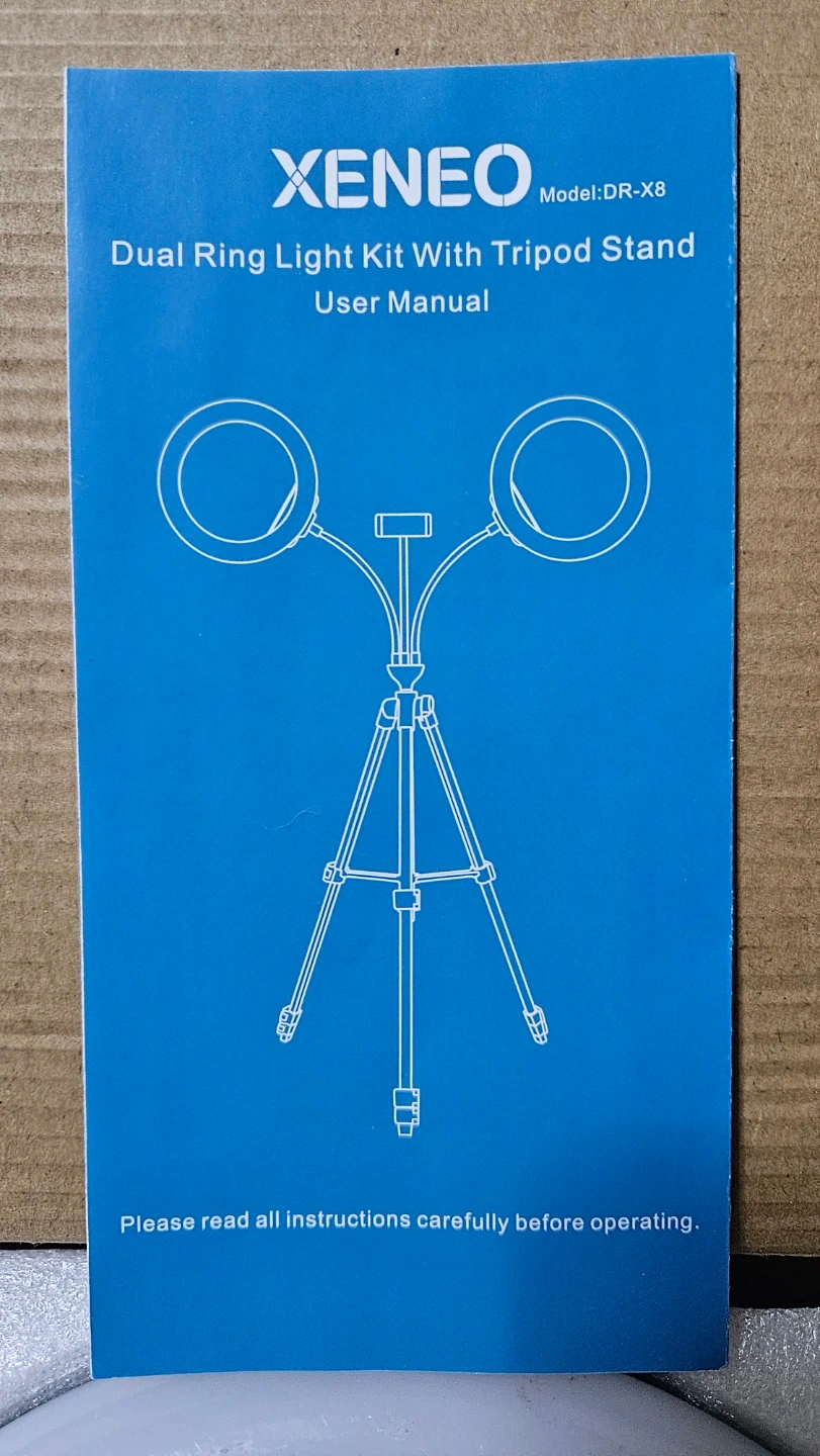 This Xeneo Dual Ring Light Kit includes a tripod stand and phone mount. It's designed for vlogging, selfies, and makeup application. It's new and comes with its user manual.