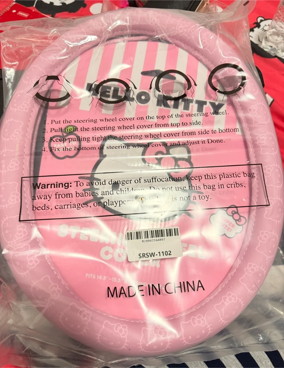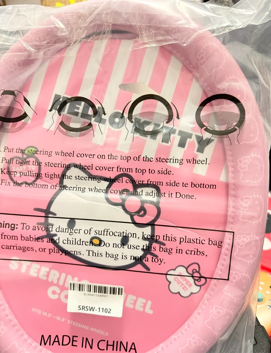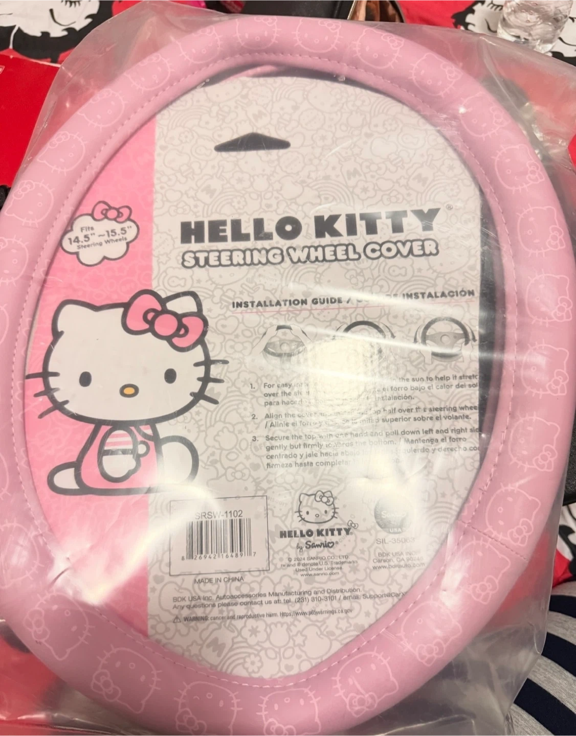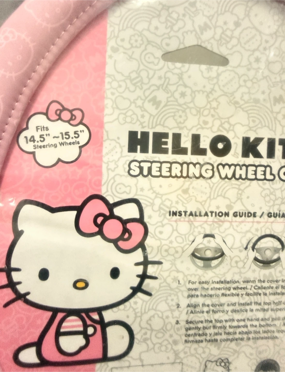 This Hello Kitty steering wheel cover is pink and fits 14.5" to 15.5" steering wheels. It features a fun all-over Hello Kitty pattern. Installation is simple and should take just a few minutes!