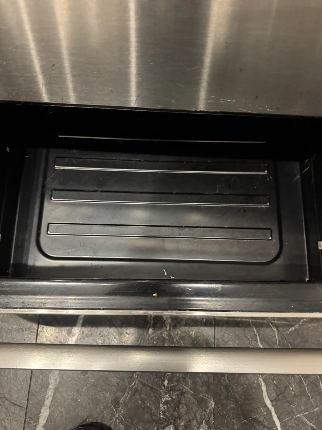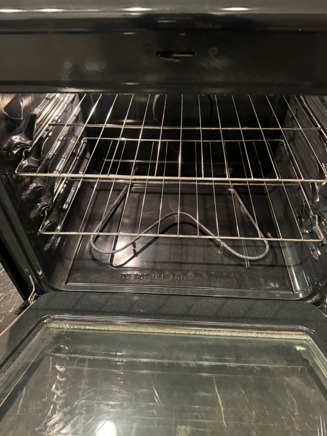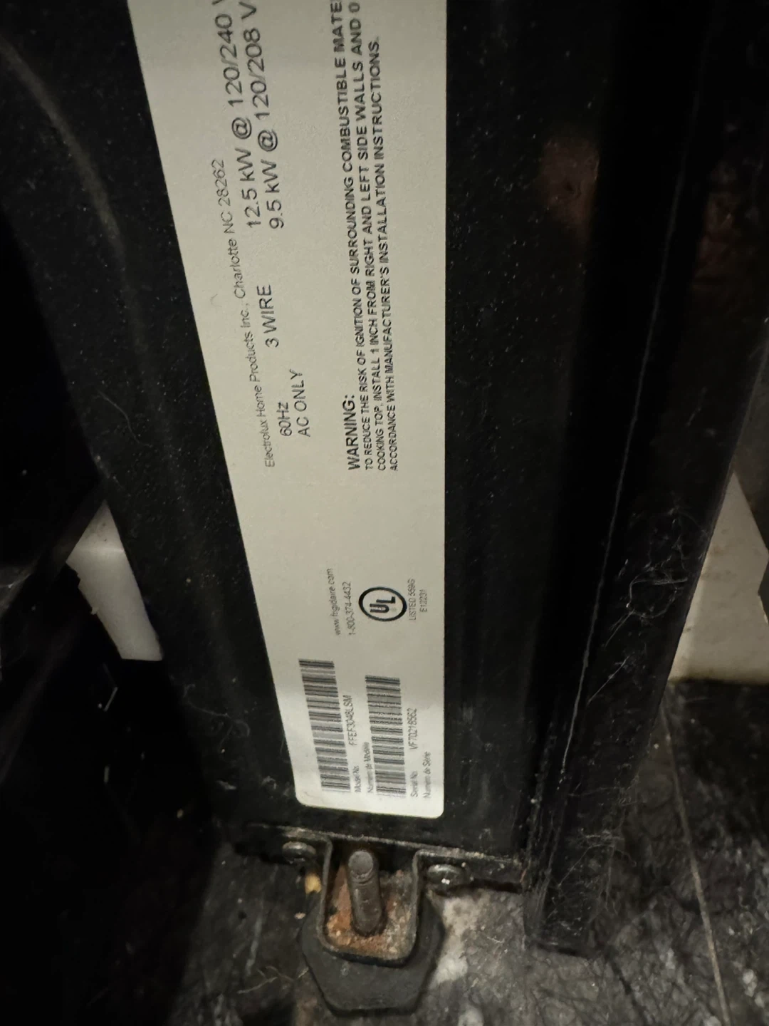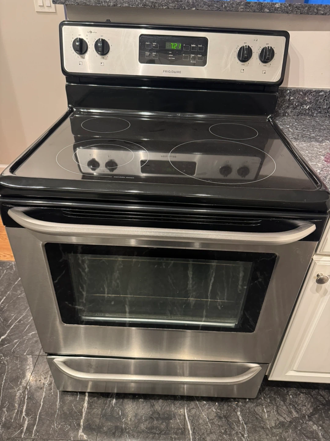 This is a Frigidaire electric range and oven. It features a glass cooktop with four burners and an oven interior with two wire racks. Includes a storage drawer at the bottom. This range requires a 3-wire, 60Hz AC connection, with 12.5 kW and 9.5 kW ratings.