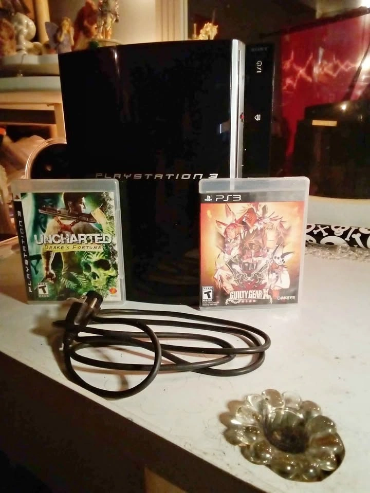 PS3 with 2 games. Uncharted being a great classic story based game. (No controller)