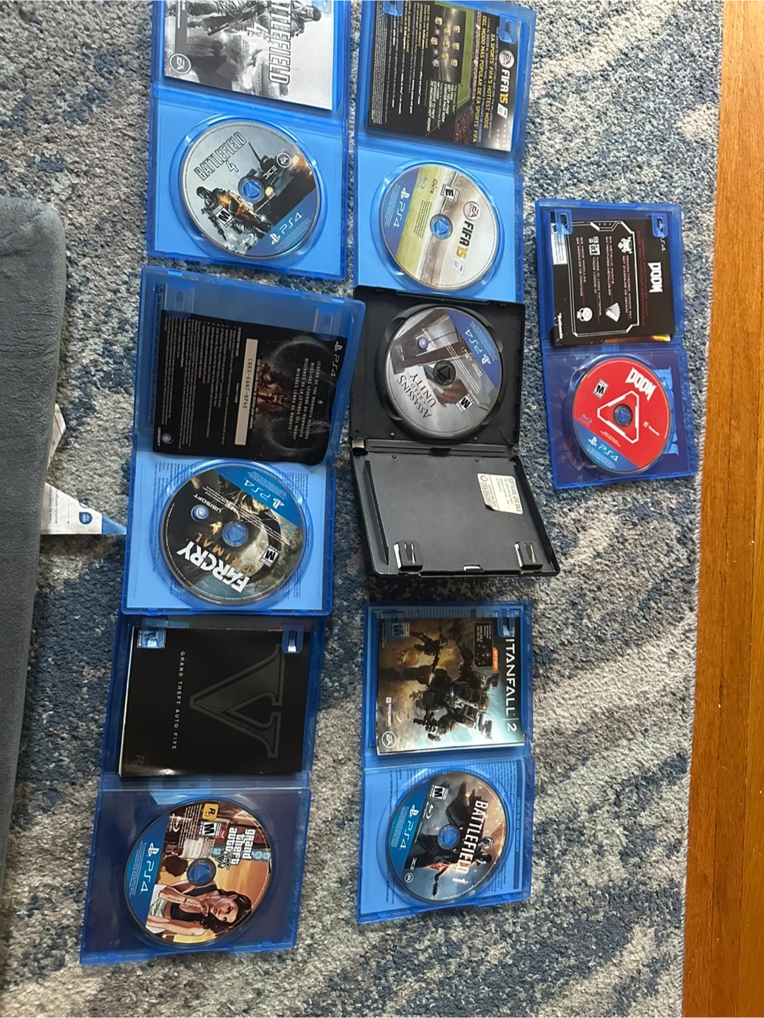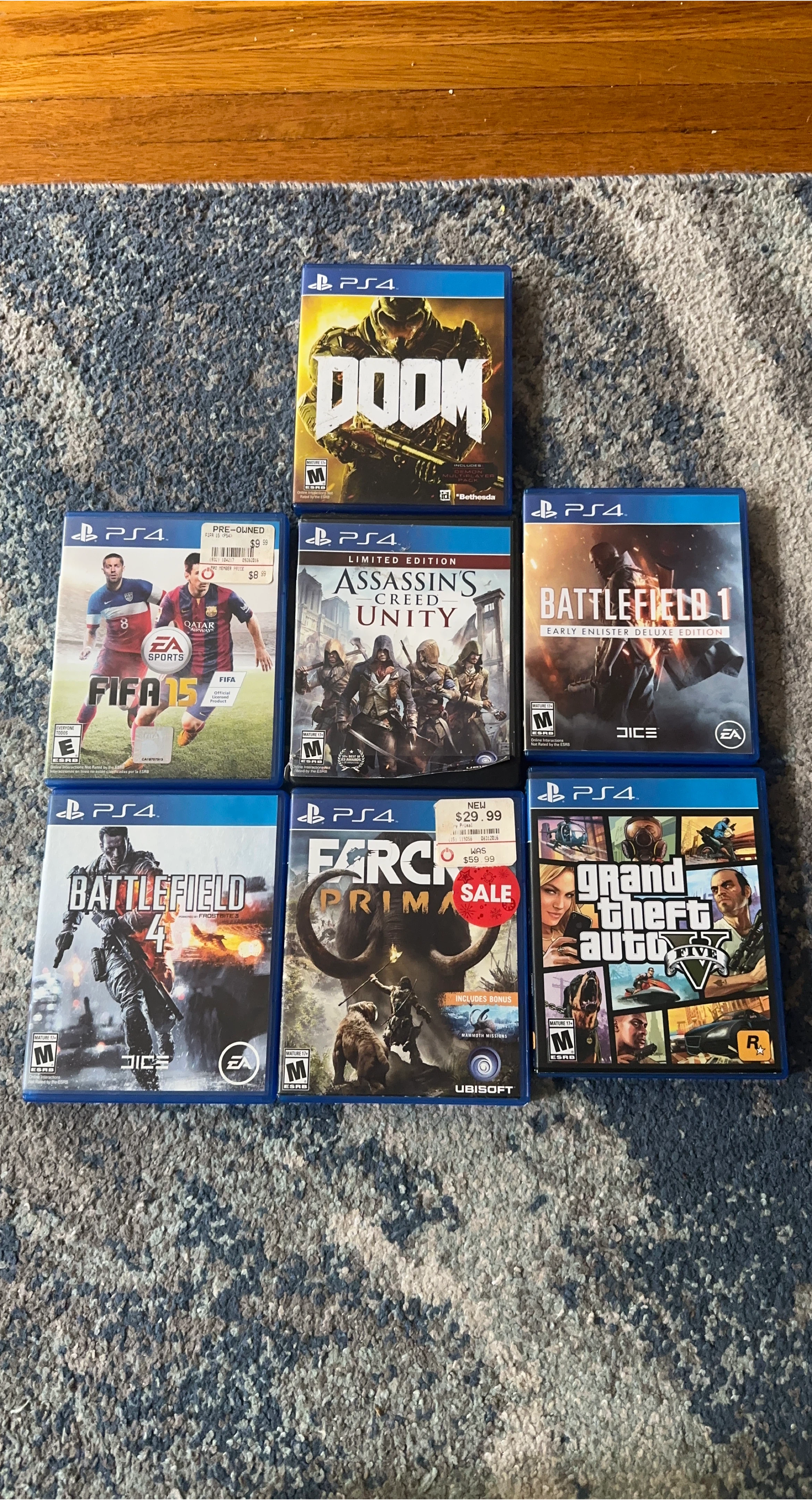 Selling a collection of PS4 games! Titles include: - Doom - FIFA 15 - Assassin's Creed Unity (Limited Edition) - Battlefield 1 (Early Enlister Deluxe Edition) - Battlefield 4 - Far Cry Primal - Grand Theft Auto V