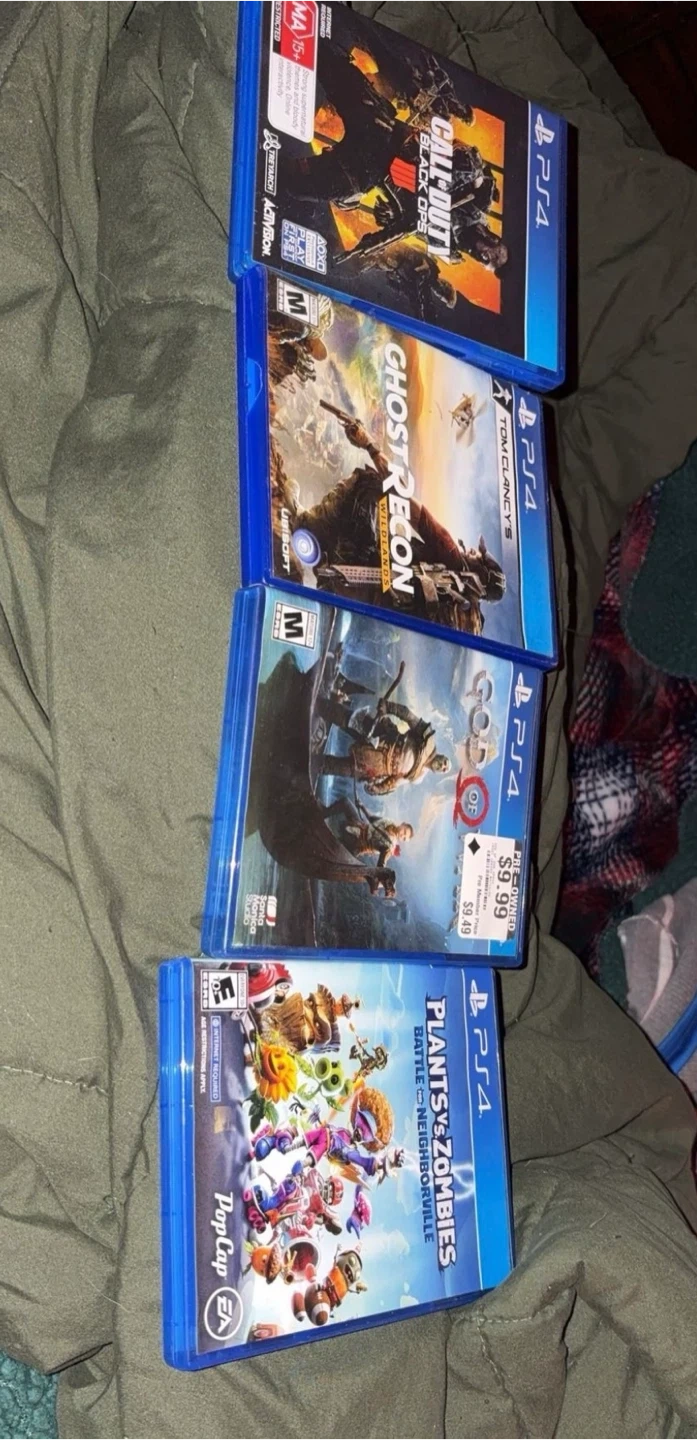 15Selling a few PS4 games: Call of Duty Black Ops, Ghost Recon, God of War, and Plants vs Zombies Battle for Neighborville. Also including a gold PS4 controller
