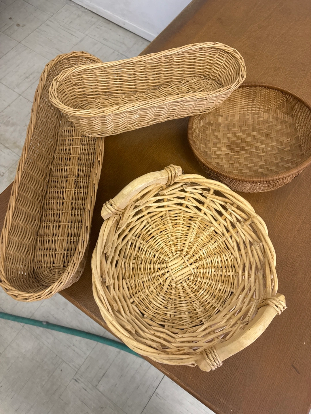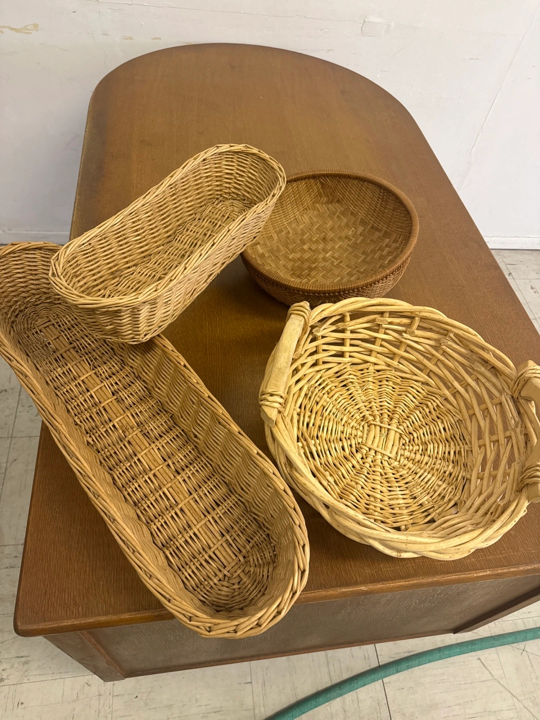 Four lovely wicker baskets. Two oblong bread baskets and two round baskets. Perfect for storage or decoration. Varying sizes.