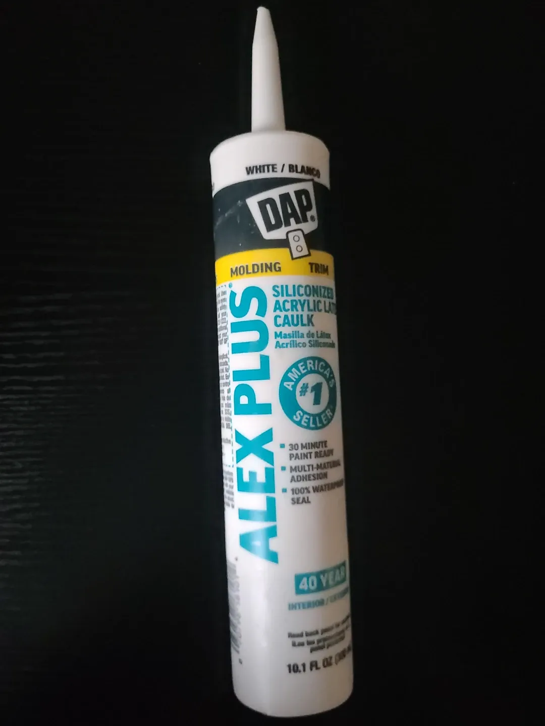 DAP Alex Plus caulk for molding and trim. It's siliconeized acrylic latex formula. This caulk is paint-ready in 30 minutes and offers multi-material adhesion with a 100% waterproof seal. It's rated for 40 years for interior/exterior use.