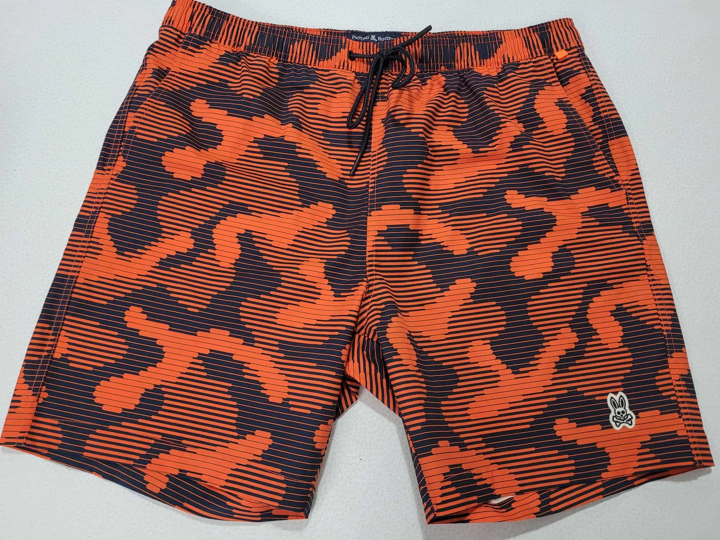Selling a pair of Psycho Bunny swim trunks in excellent condition! They're a size XL and feature a cool orange and navy pattern. Perfect for the summer!