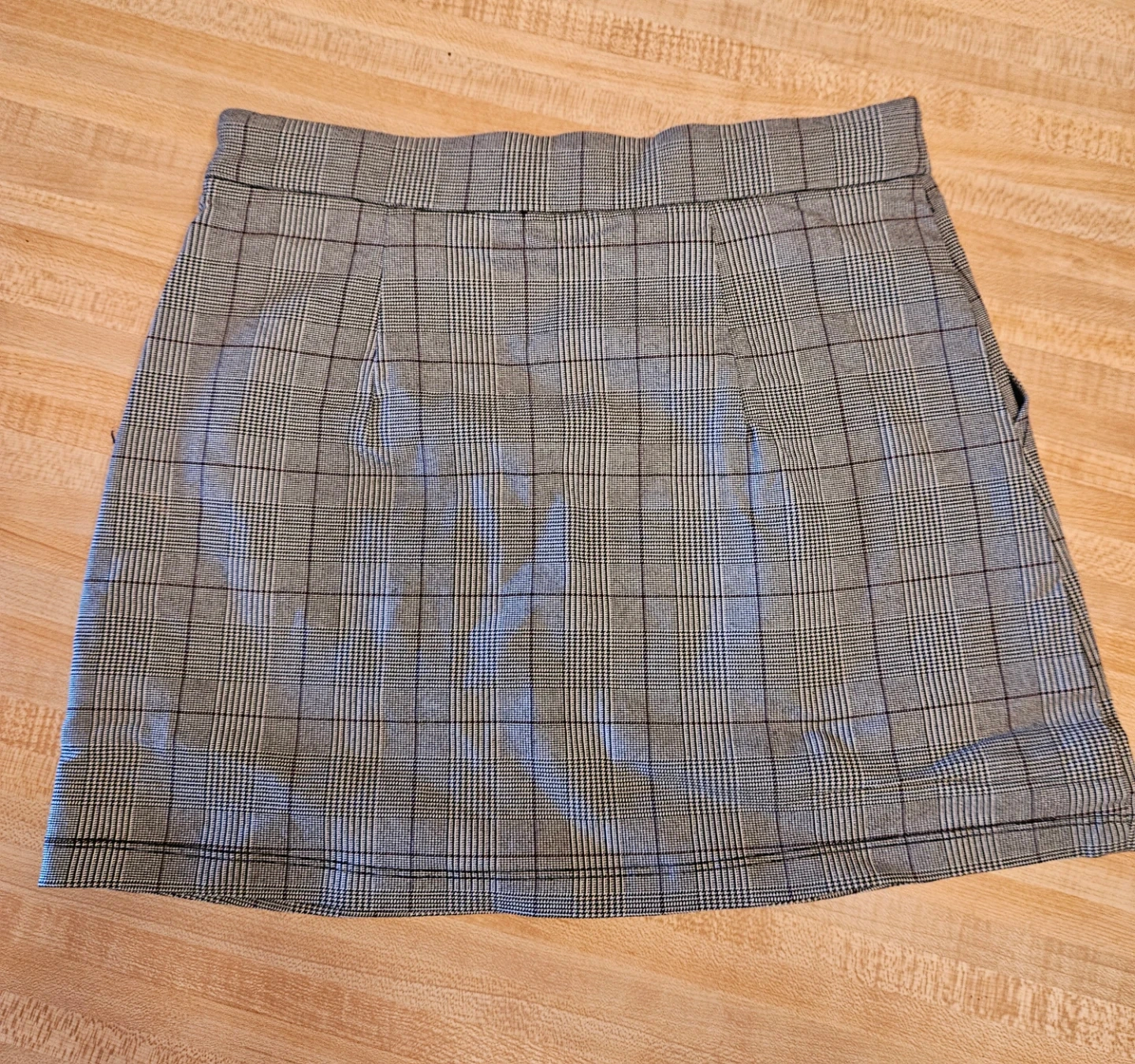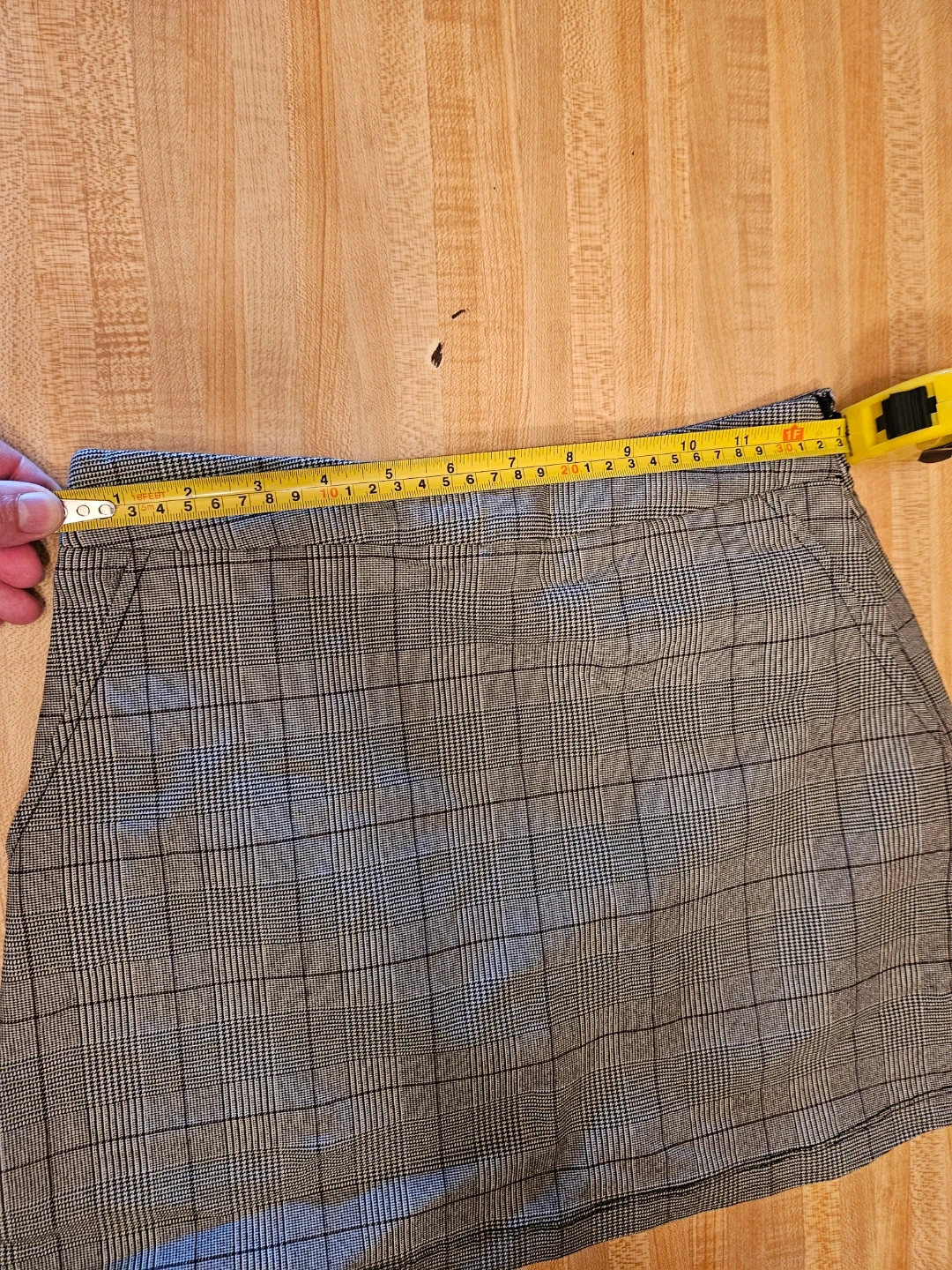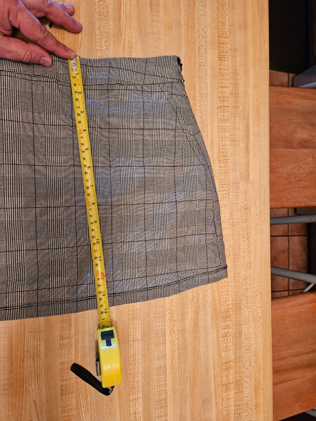 This is a plaid mini skirt with a zipper closure. Waist measures 15 inches flat, length is 18 inches. Made of polyester and rayon blend. Great for casual wear!