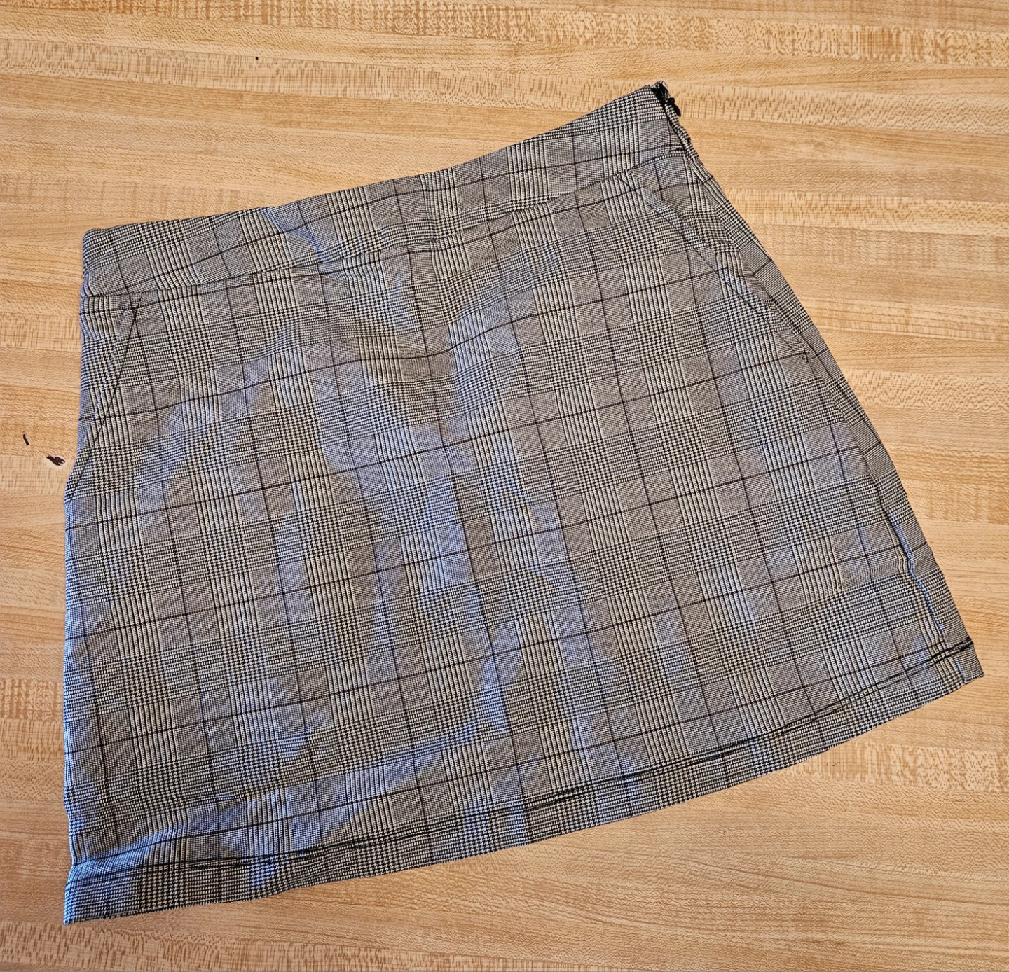This is a plaid mini skirt with a zipper closure. Waist measures 15 inches flat, length is 18 inches. Made of polyester and rayon blend. Great for casual wear!