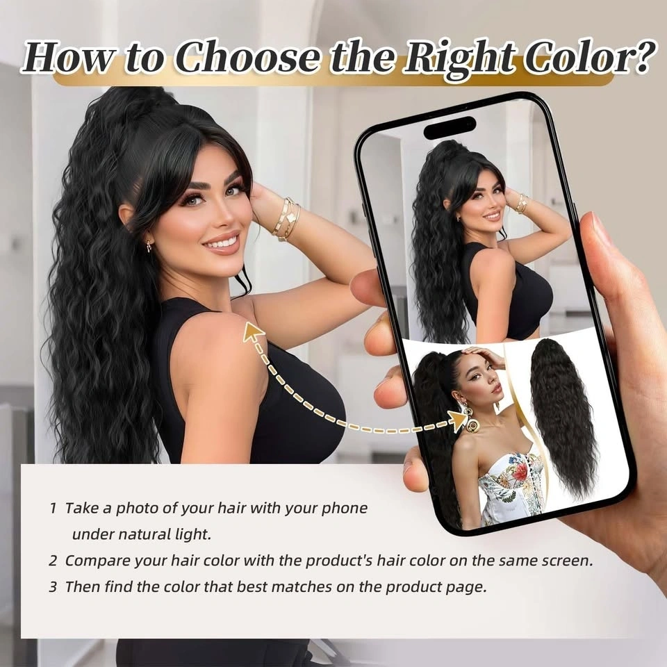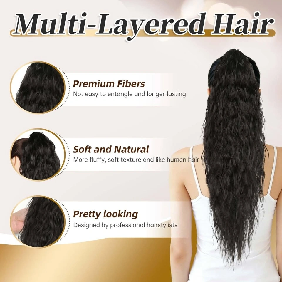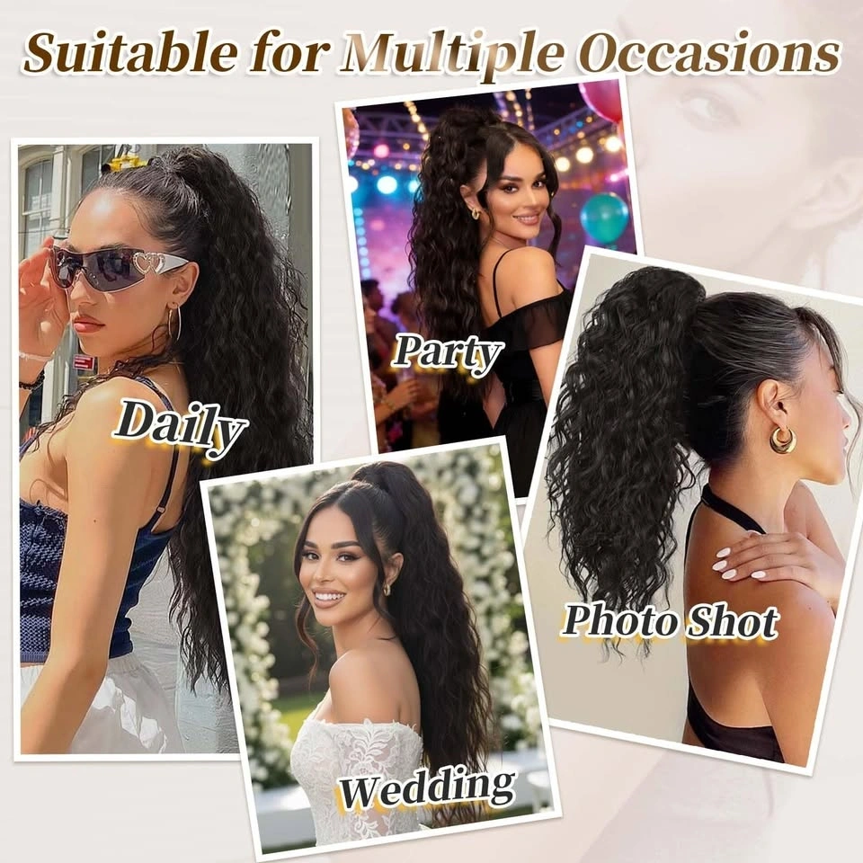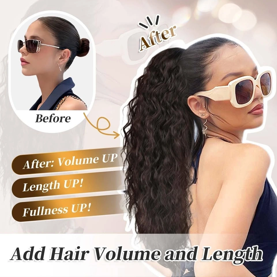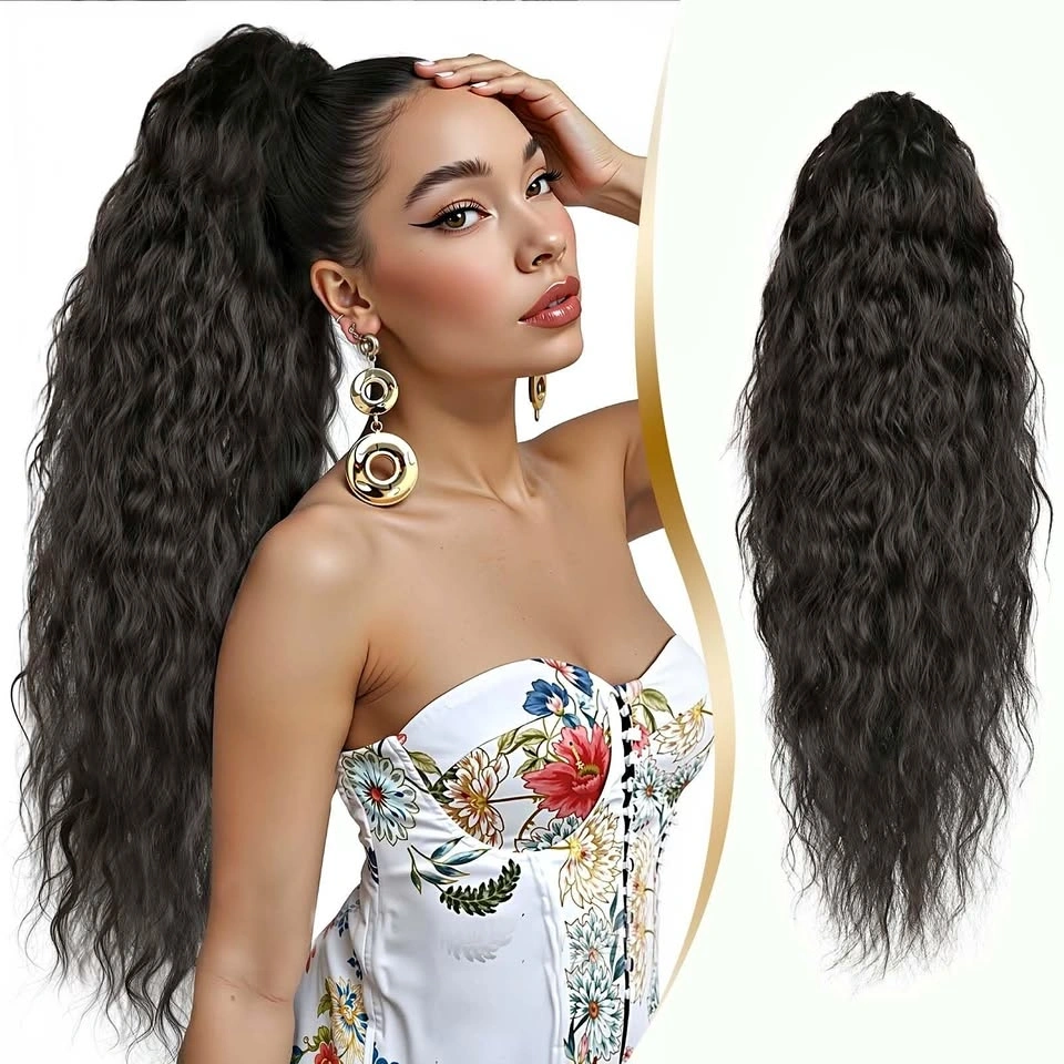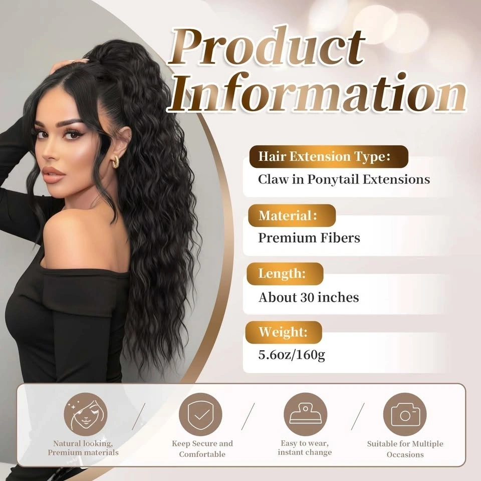 Fluffy black brown ponytail extension. Vizfrucean brand. 30 inch long wavy style. Has a claw clip for easy wear. Made with premium synthetic fibers. Looks natural and good for daily use or special occasions. Let me know if you're interested!